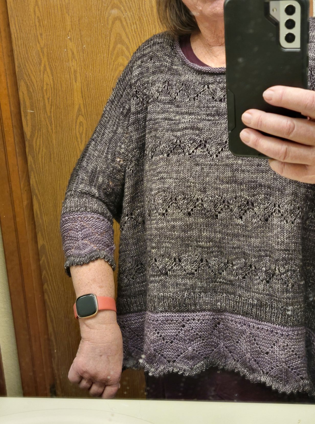 I ripped out the lace at the bottom of the sweater; I had added the original lace to make the sweater longer, but it didn’t look all that, well, lacey. This is what it would look like with this new lace, slightly purple, knitted lace substituted for the original stuff.