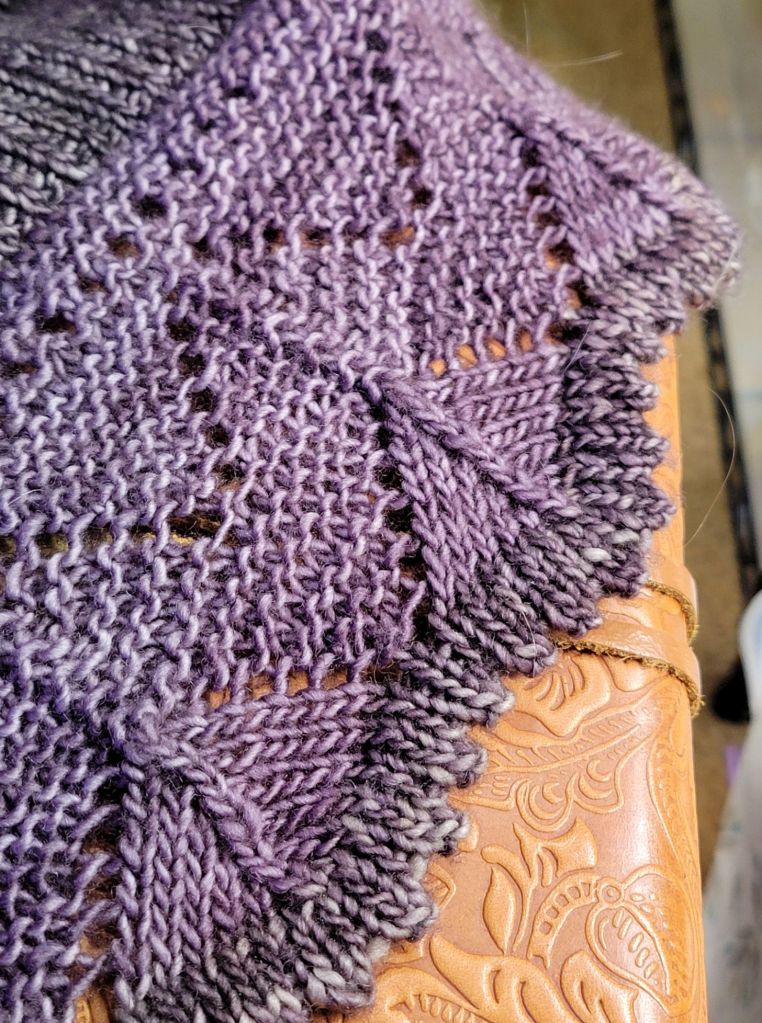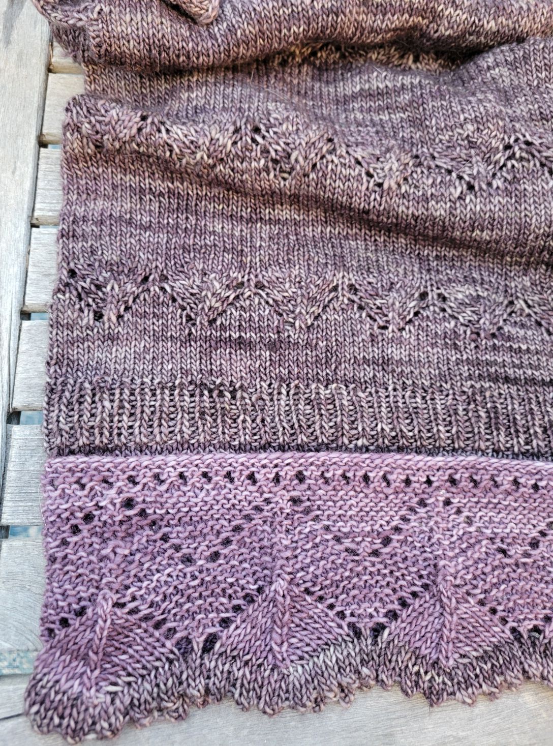 Oh, yeah. I decided that this lace looked better. I mean, purple, right?! Feeling pretty encouraged I ripped out the lace band on the sleeves and swapped in the new lace. Then, wanting to pull the look together, I ripped out the edging around the neckline and reknitted in the new color.