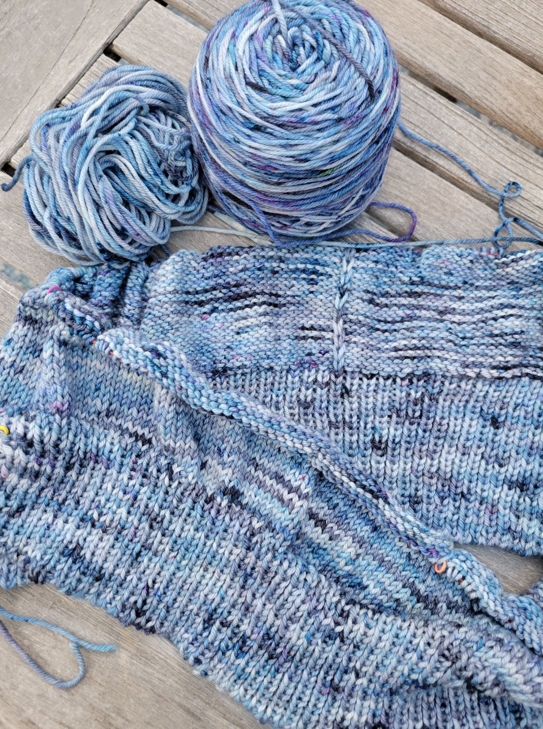 My original sweater was knit in a limited issue color called Ironwood. Since I could not locate any more of the original color I hunted for something that would work with the sweater and my wardrobe. Enter Penumbra, that dark dusty purple layered on grey.