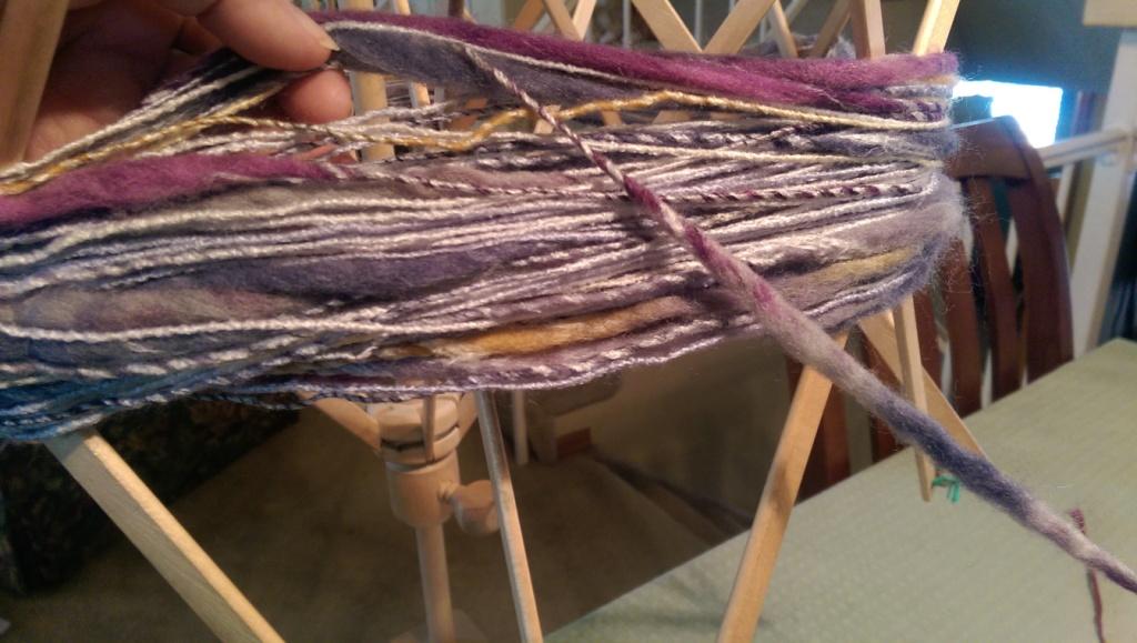 The yarn is a single ply bamboo yarn with 6 inch strips of unspun wool inserted every three feet or so. The barber-pole sections are where the connections between the two fiber types were made, Wow. I think that I need to spin me some of this yarn. With beads!!