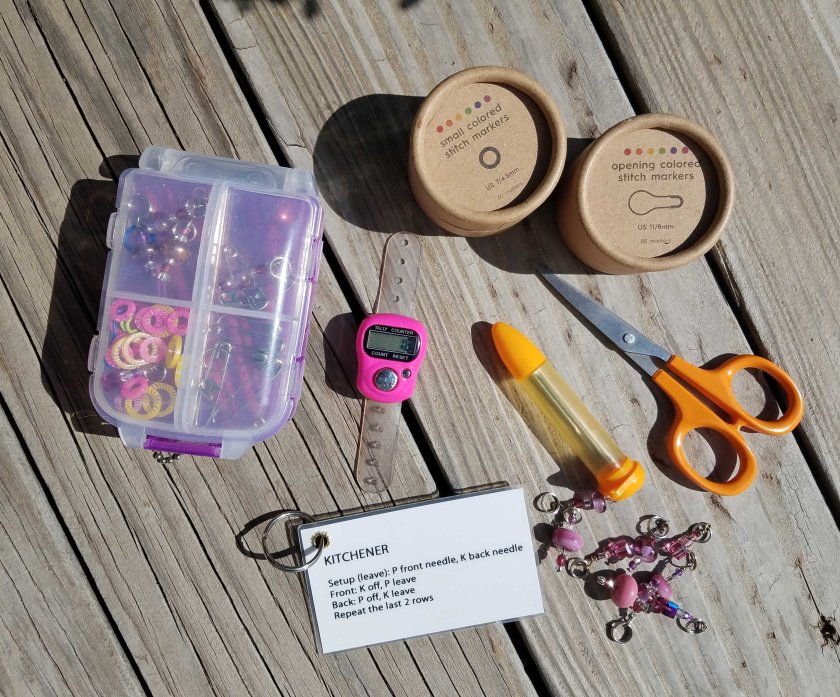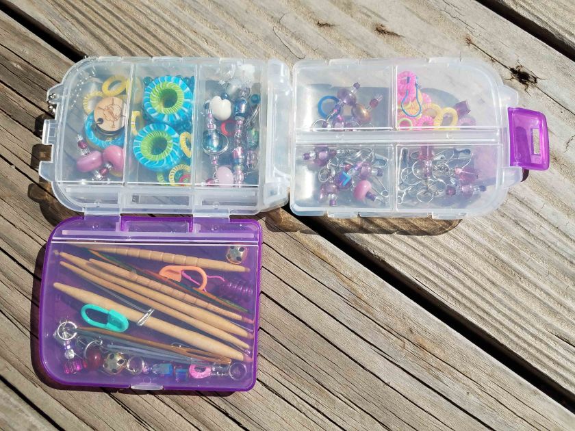 Hmmmmm. Interesting. Well, I have a little tin that holds my favorite stitch markers (removable light bulb markers, triangular stitch markers both small and larger sizes), a bent tip tapestry needle, miniature scissors, small double tipped crochet hook for caching dropped/split stitches, a tiny Emory board and a small pair of sharp nail clippers. That little tin has to be near when I am knitting. That nail clipper gets used A LOT!