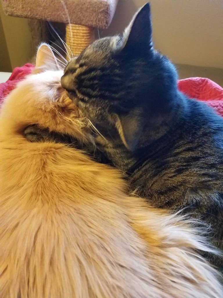 It took a few weeks, but with enough toys, his kitten, and lots of positive attention (and scratching posts) his behavior changed and he transformed into the cat I have today. He’s still a handful, but he (mostly) wants to please me.