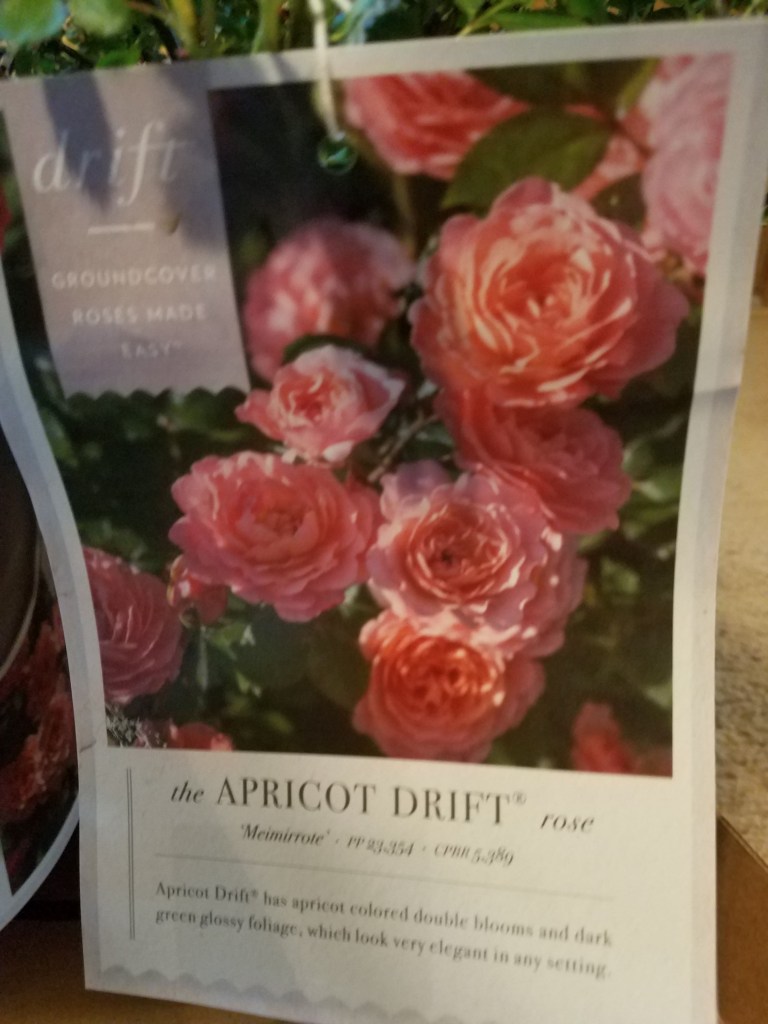 These guys. I actually was thinking of another color of this exact rose type for the front of the house, but once I could see the actual plants and the labels that showed a better representation of the colors and the bloom, the apricot rose won me over. The perfect purchase for Earth Day.