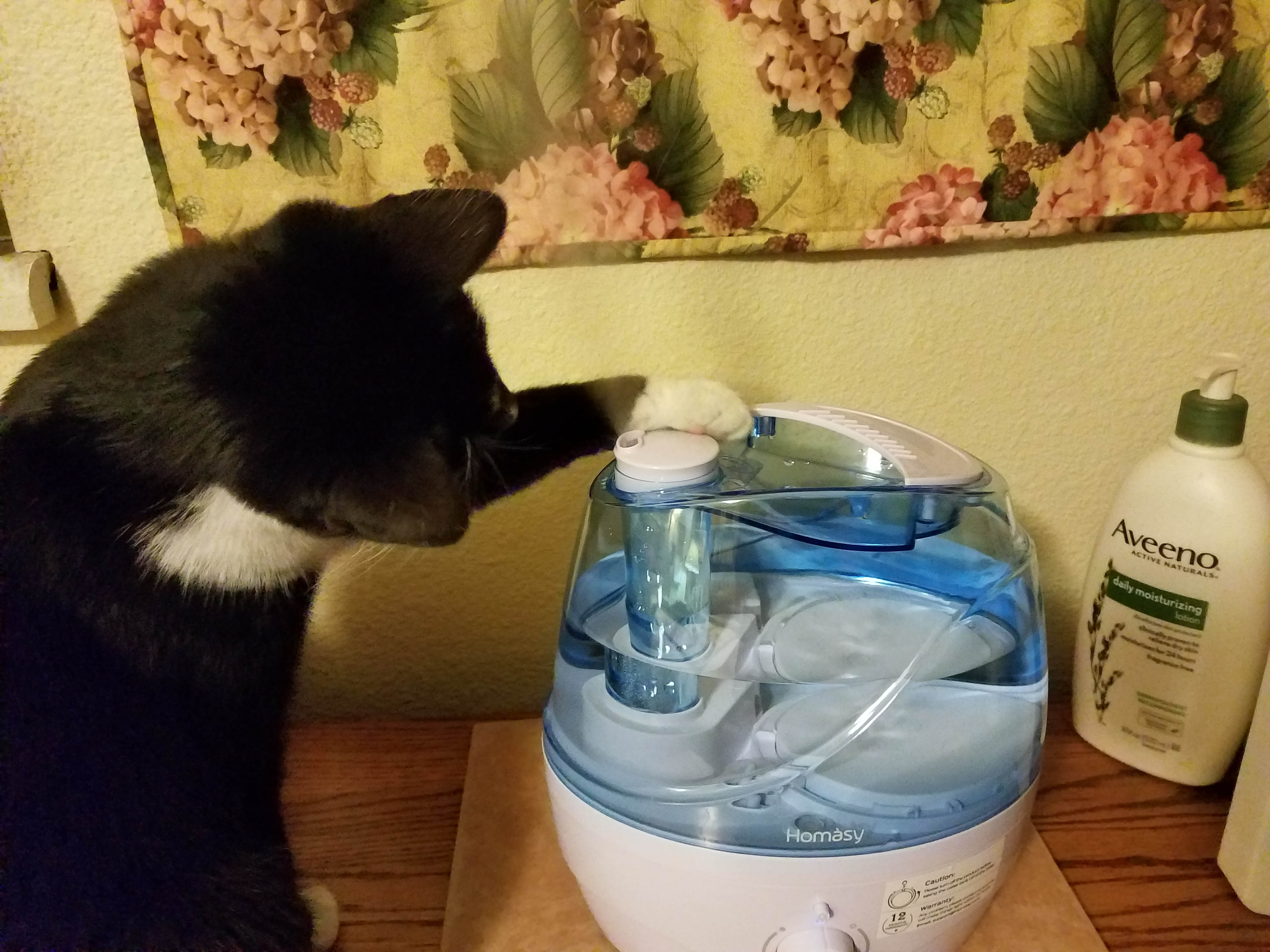 I have to check all of the waste baskets every single day for toys; you wouldn’t believe the stuff that gets put in there! There is this little camera on the bookshelf in the bedroom that keeps making noises… what is up with that? I make sure it isn’t up to something nefarious when it starts making noises at me. So maybe I do nudge it a little on the shelf to see if I can make it move some more… or fall down… If Kitten Mom doesn’t keep her knitting bag zipped you know there are some fun toys for me in there! Last week we put together this little machine that makes fogs of water for me to play with: it tickles my paw when I play with it. Oh, yeah. I did get into some trouble for pulling out MacKnitzie’s whiskers…. But the biggest trouble of the whole week happened when…