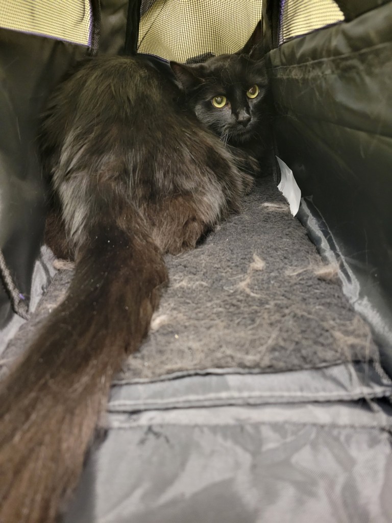 Hannah’ summer coat is very smooth and sleek which helped her in the escape-from-the-crate efforts. I’ll give this one more attempt, but as I told the vet, this isn’t worth me getting a cat bite, or Hannah getting that upset that she would bite me.