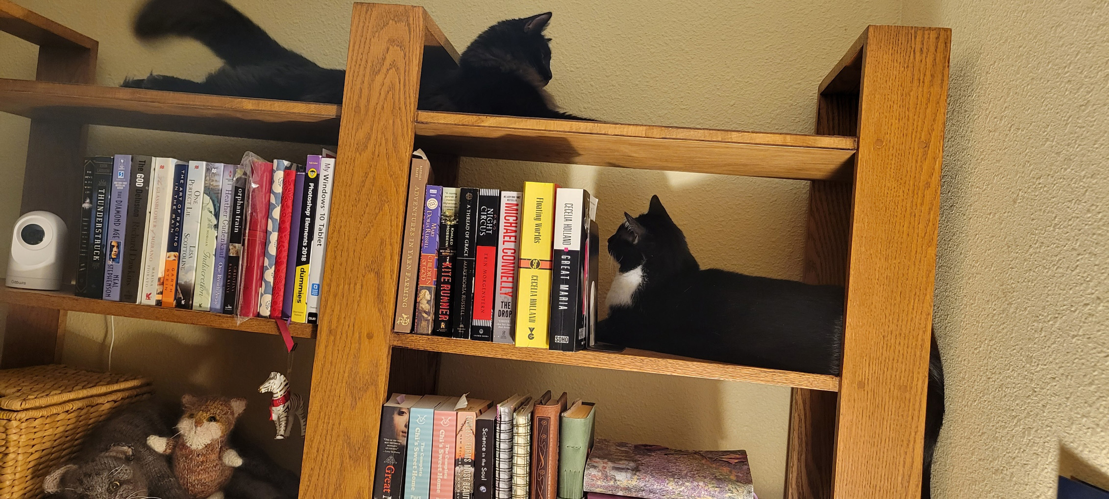 Mateo and I kind of come back to life in the evenings when we head downstairs to watch the baby bunnies in the back window (it’s bunny o’clock then!) and in the late evenings, when the Mother of Cats moves upstairs to read before bed we move onto the bookshelf, up by the ceiling fan for the night.
