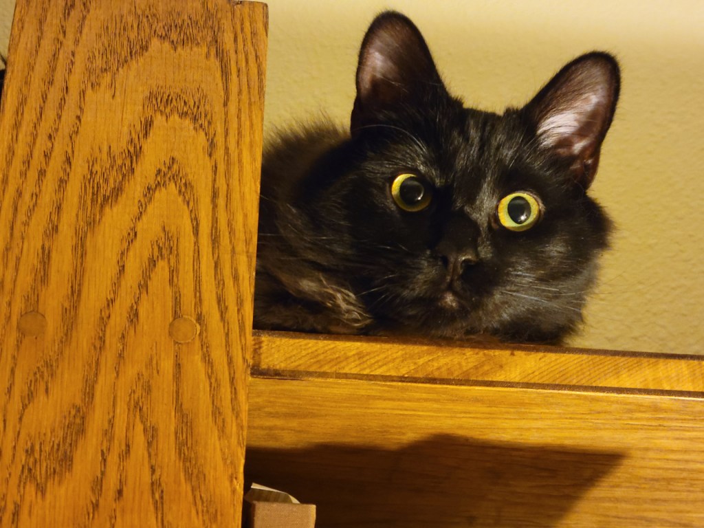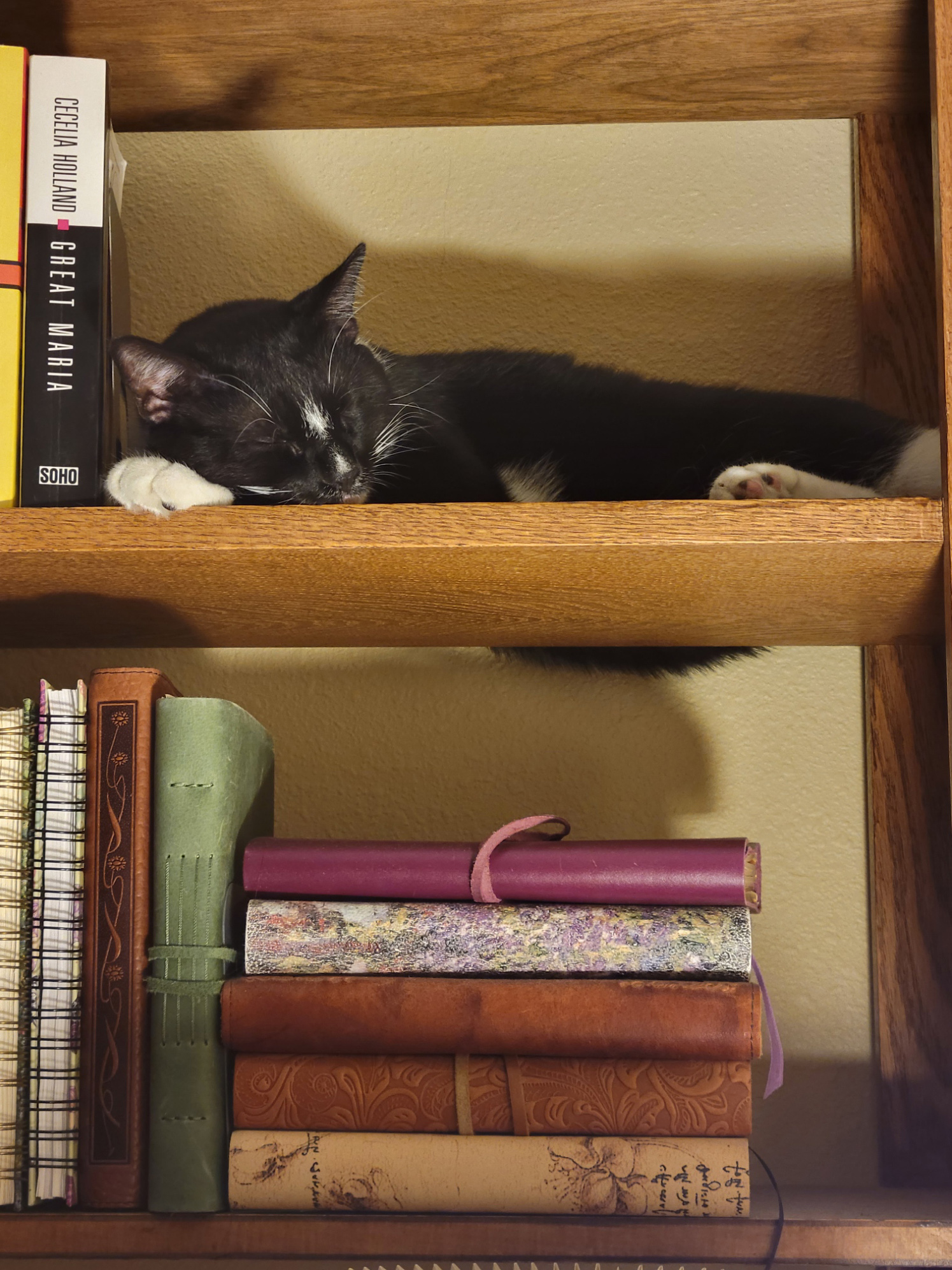 Hannah: The Mother of Cats took this picture crooked, but you get the idea. I sleep on a shelf with books, and Mateo the wild boy sleeps up on the top shelf.