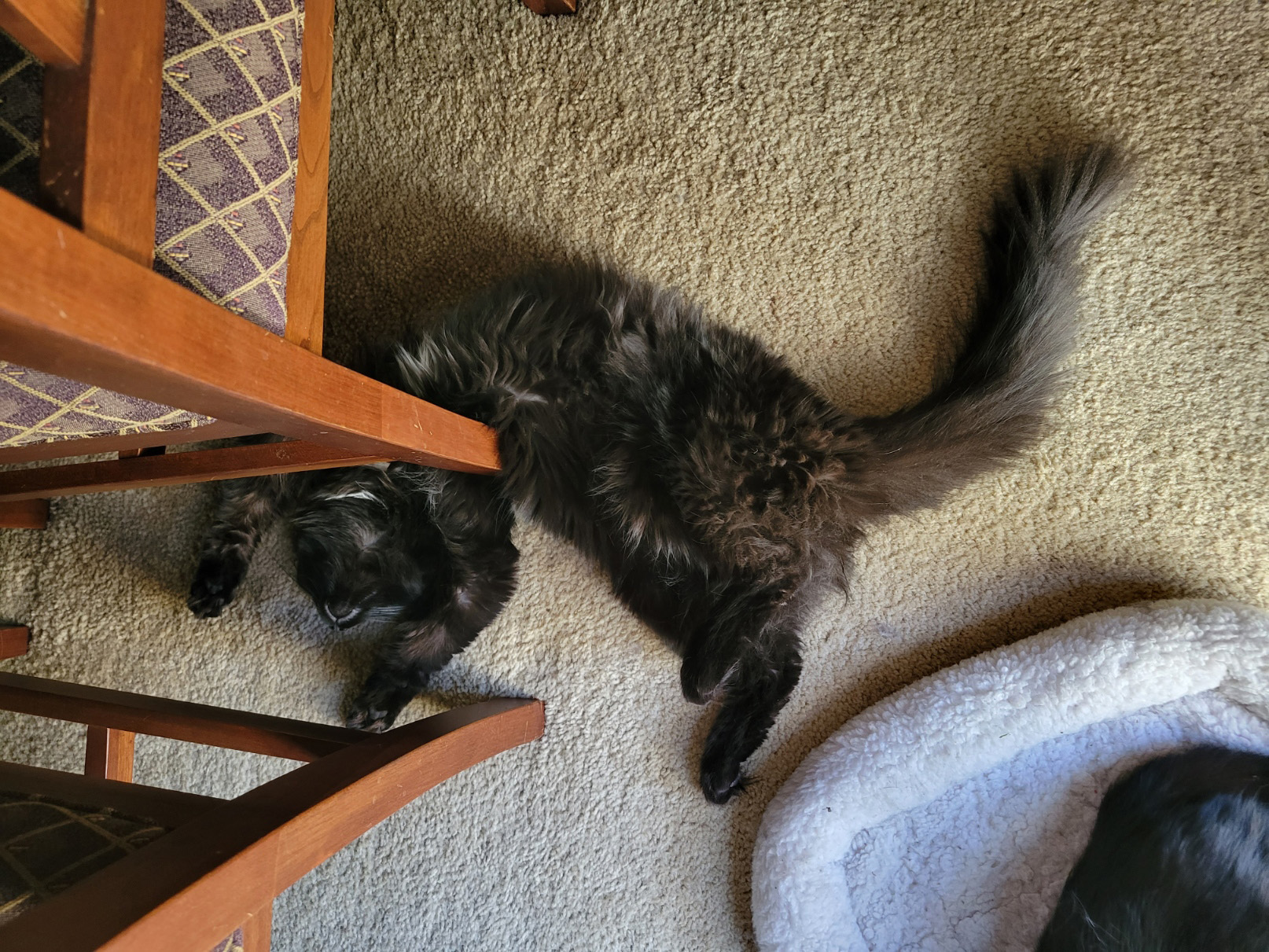Now it is the day, and we are asleep again in the cool by the AC unit. All of the squirrels and bunnies are asleep too, and there aren’t even bees moving around outside. It’s only noon but it is already 95 degrees outside and the Mother of Cats is searching the sky in hopes of some thunderstorm clouds for this afternoon. She likes the rain, but the CoalBear doesn’t like the thunder at all!!