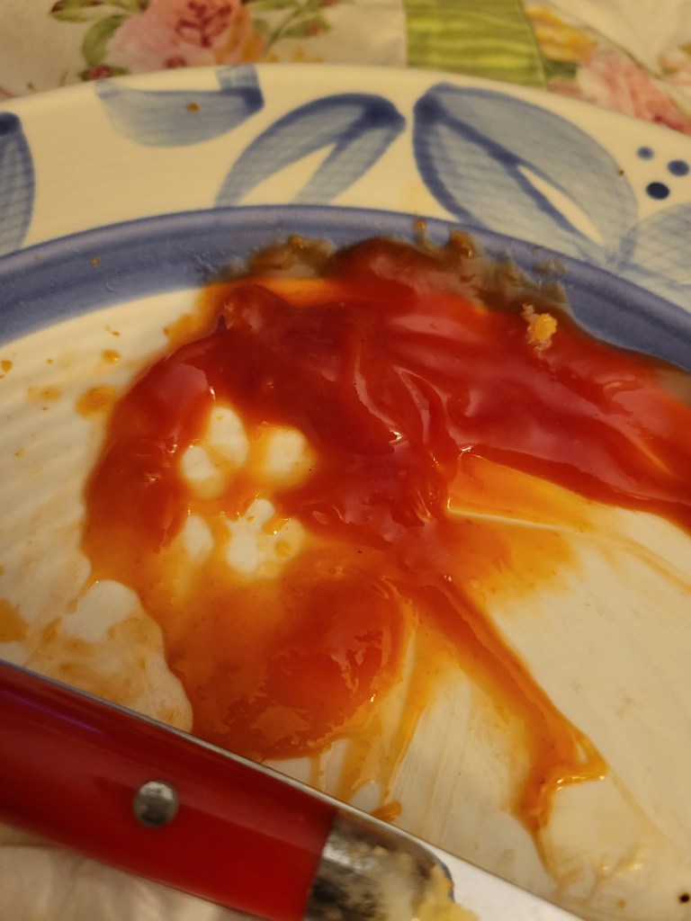 Such a perfectly shaped catsup paw-print, too. It’s not even smudged or anything.
