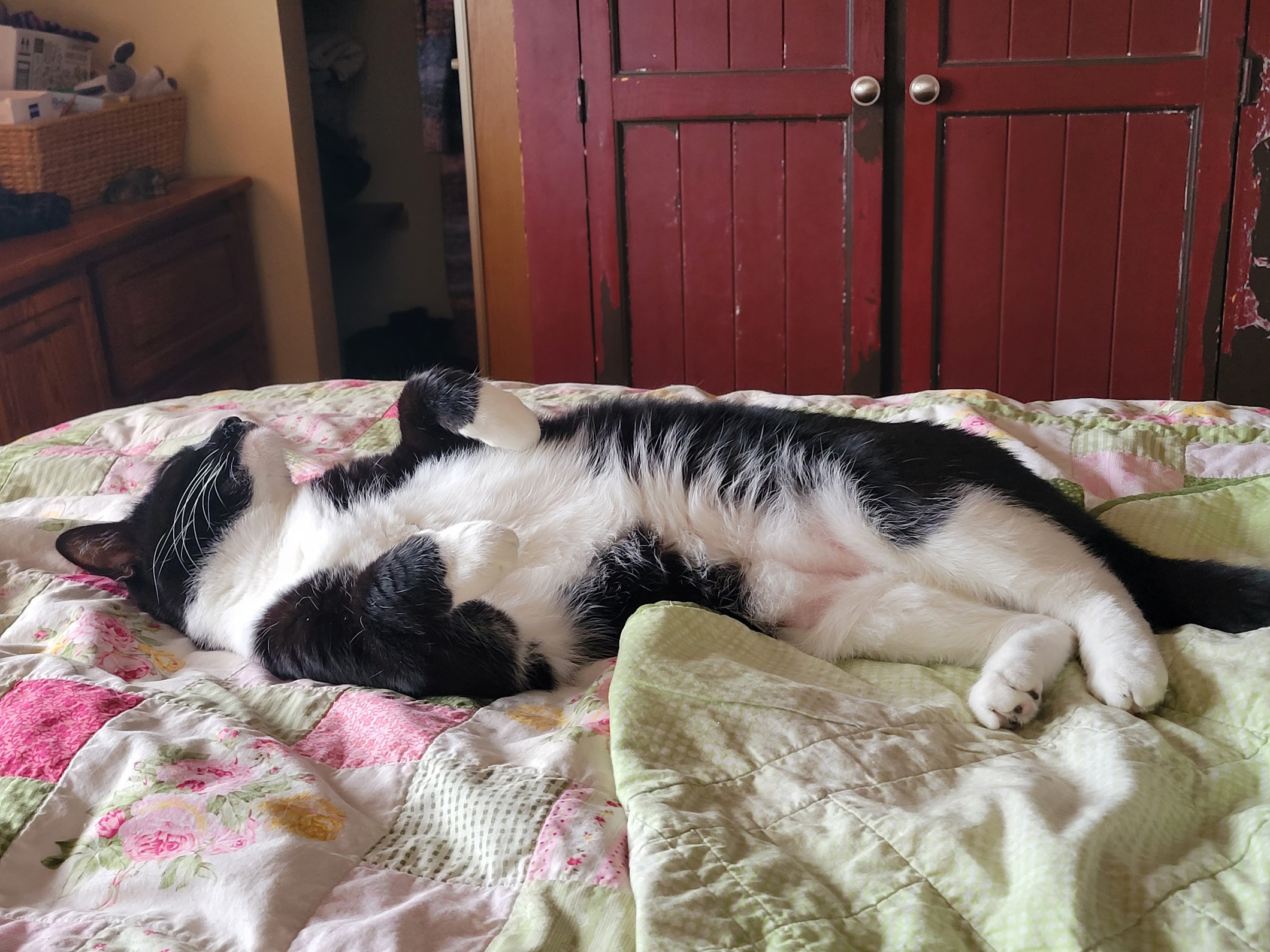How about this one? Hey, this is what the Mother of Cats gets for eating in bed, right? It’s not my fault that I tracked catsup footprints all over the white linen duvet cover. See the above comment about eating in bed…