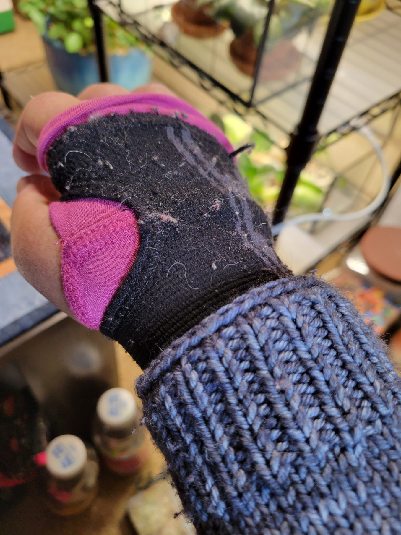 By Thursday she was wearing a compression wrist brace and started knitting a little sock. So cute, right? Now after knitting for three days, it is starting to look cute, and I’m thinking that it could use a little grooming. Nope. The Mother of Cats keeps it zipped up in a project bag where I can’t get ahold of it. Don’t you think that the sock would look better if it was a little fluffy? As I’ve discussed before, the Mother of Cats is not good at sharing her things…