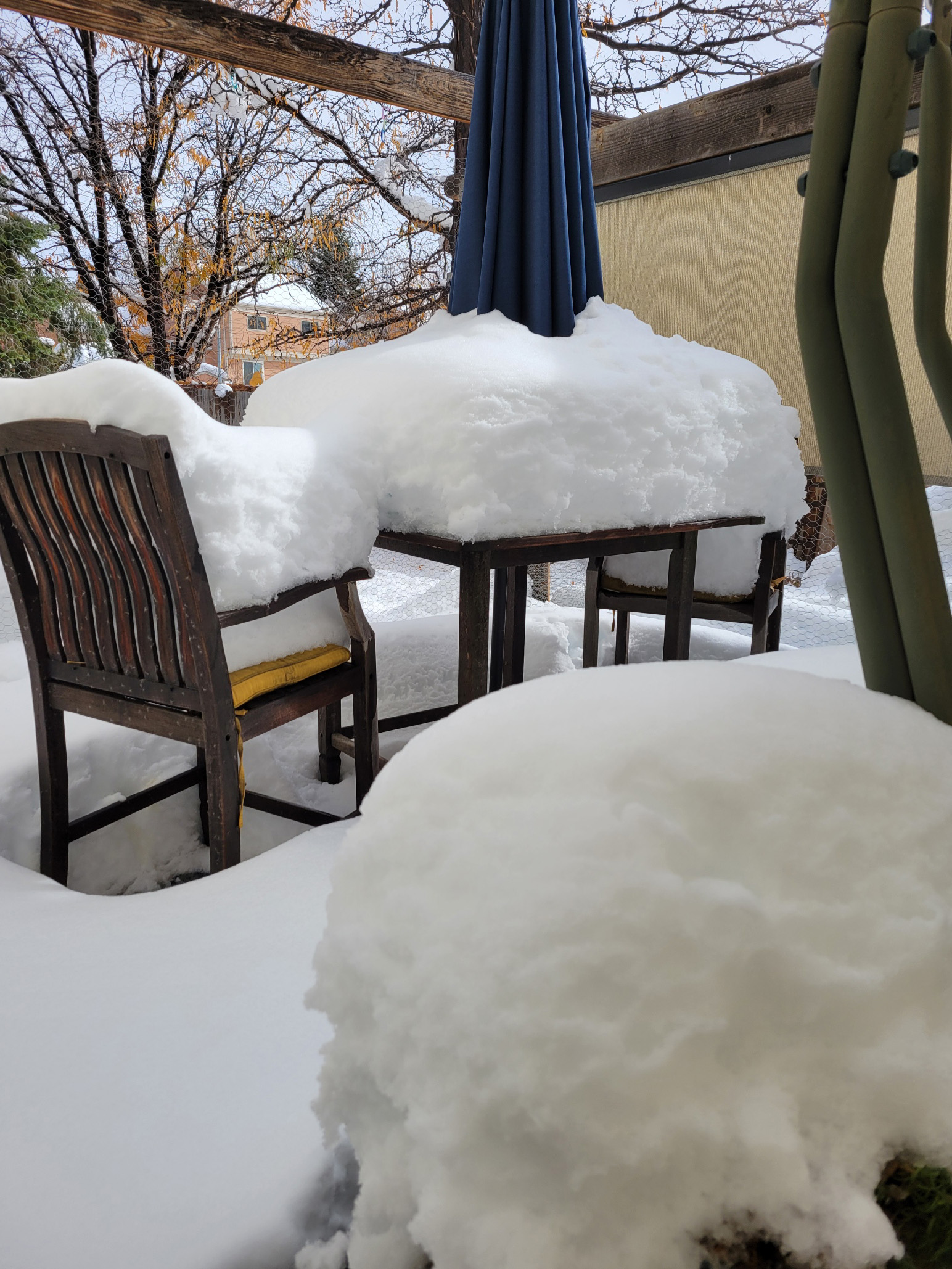 What a load of snow! When I looked on Ventusky the other day to check on Rafael’s progress (family in coastal Texas), rain bands flipping off that hurricane were trailing across Colorado in the form of snow showers. Yikes! It seems too early. I don’t know about you, but my brain hasn’t transitioned from summer yet. I have to admit that when I saw that foot or so of snow on your patio furniture, my hands were itching to take my leaf blower to it to see if it would make short work of clearing it off because it looked dry enough to do so. Yeah, I know. Weird.