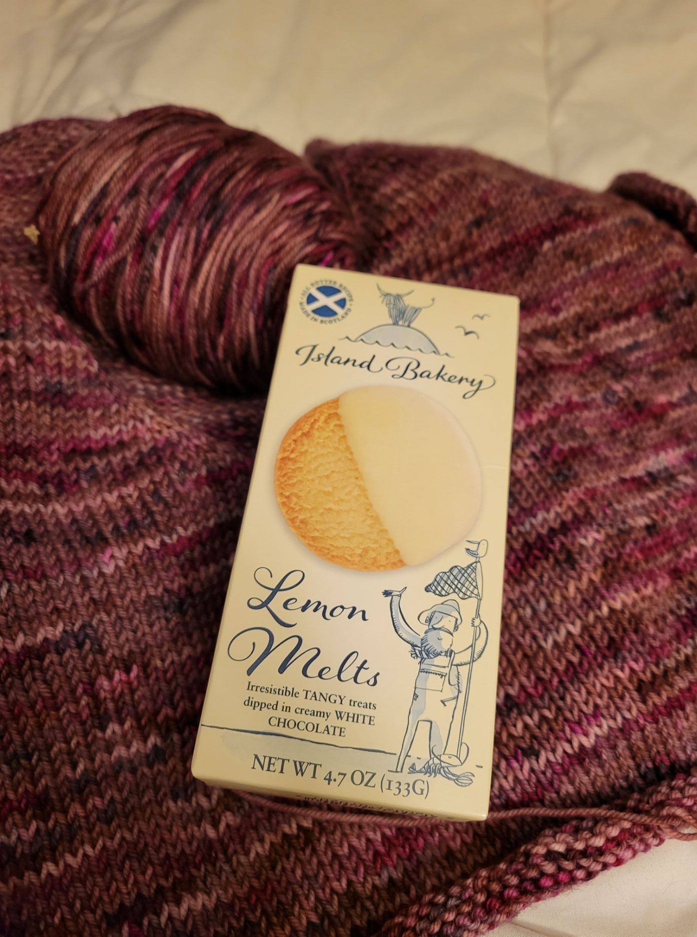 1. So you must be reading while you knit? Or knitting while you read? That’s a pretty wild list of new projects, but anything to keep you out of trouble, eh? I’m constantly donning or doffing sweaters or sweatshirts, so that cardigan sweater looks the most interesting. And the cat doodle socks are adorable but look insanely complex. But what do I know?