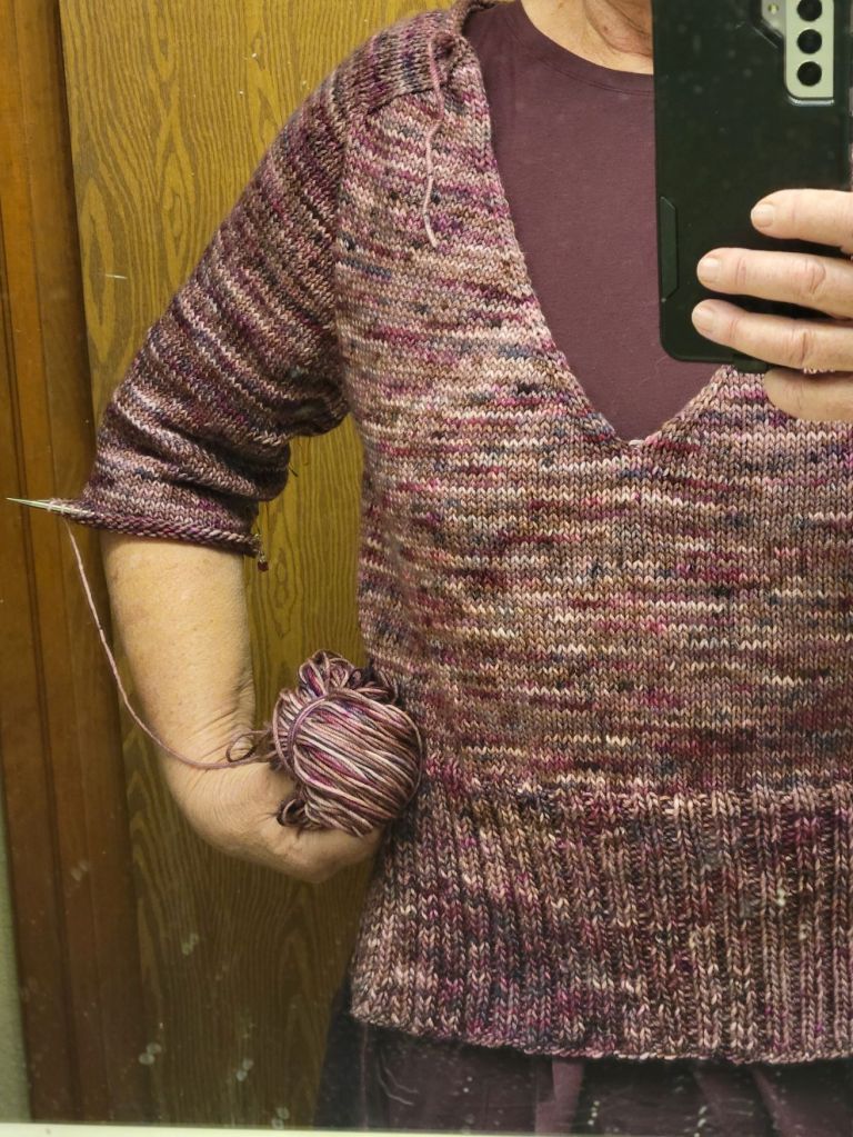 • The sweater is the Alchemist Pullover. There is going to be ribbing added later around the neckline, and I am already worrying about yarn chicken…