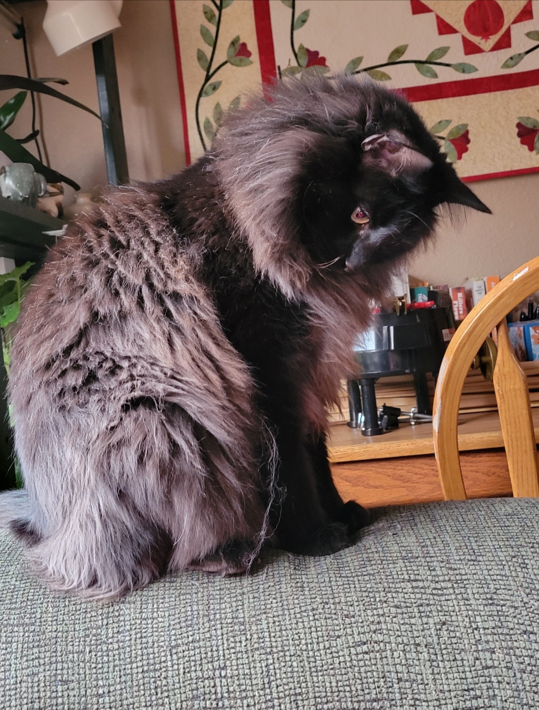 I was mostly a black cat, and the Mother of Cats was pretty amazed to see all the long fur growing in as she didn’t expect it. Last winter my coat was kind of brownish-grey, and it was really pretty long.