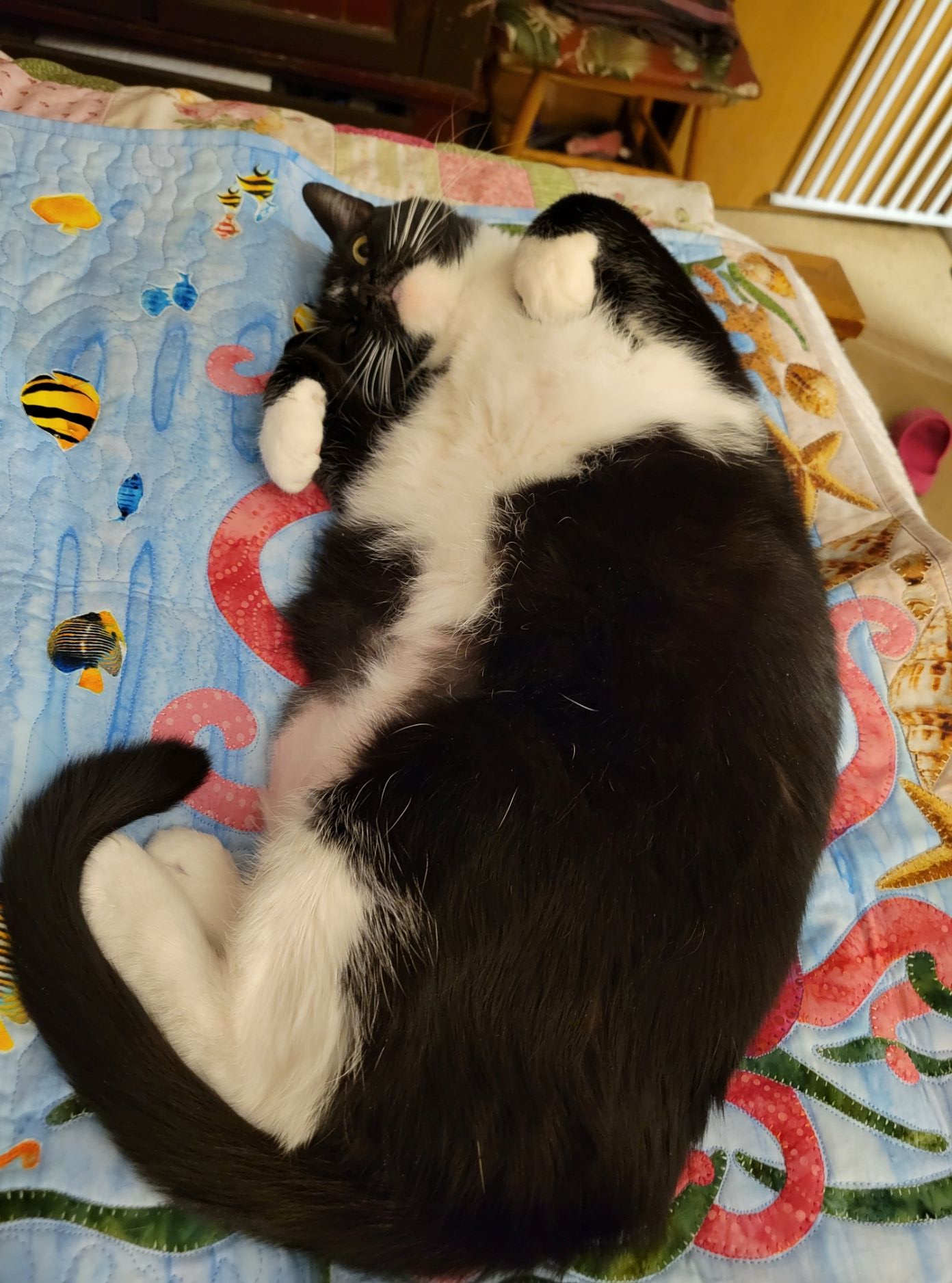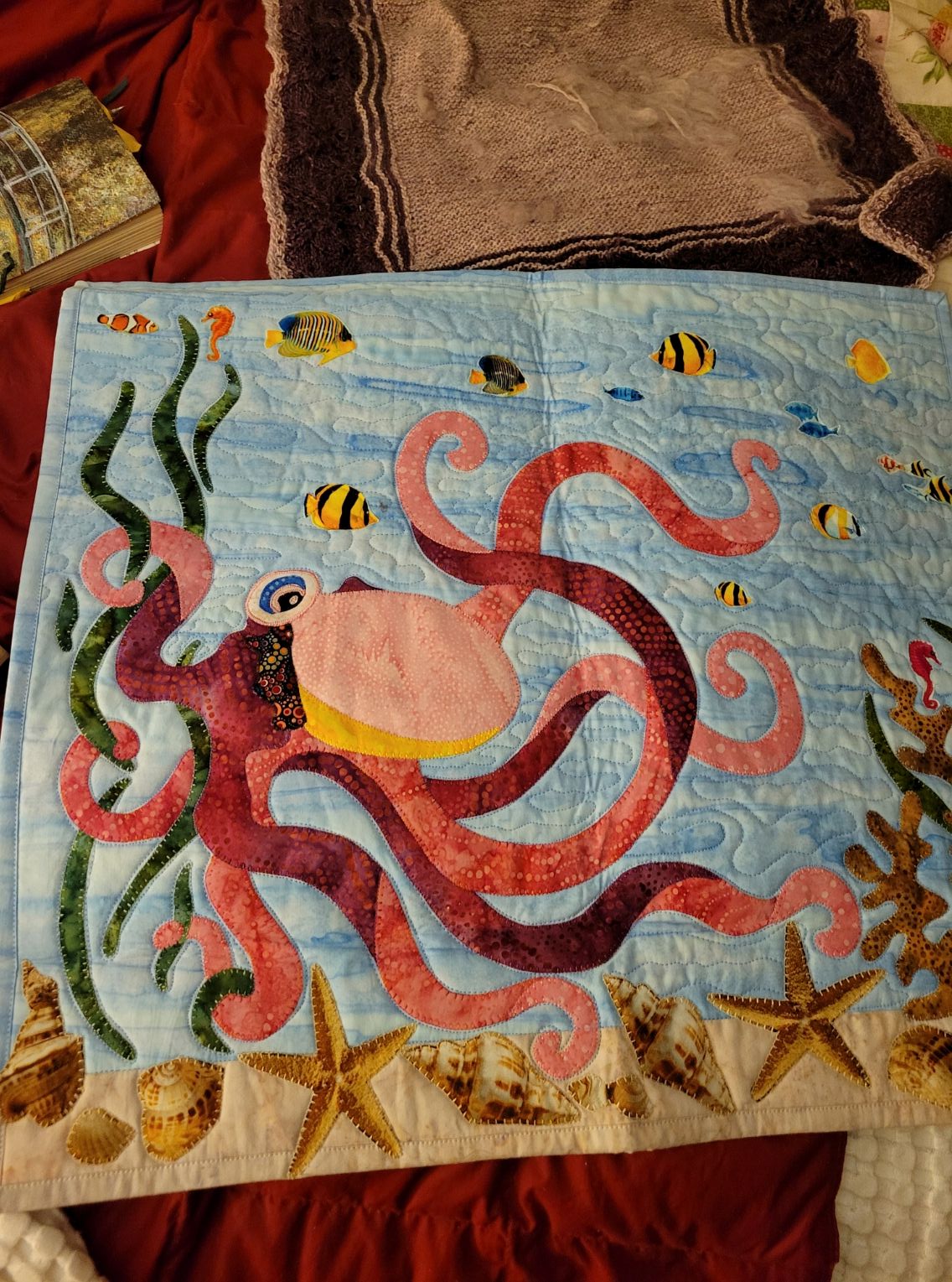 What else is going on at Casa de Kitties? The Mother of Cats went shopping and came home with another stuffed octopus. Then the Mother of Cat’s cousin sent her a cute little octopus quilted wall hanging for Christmas. Sorry, Mother of Cats. This is the best little Hannah bed ever!!!!! This evening, she put it up on the wall where it is cute, but I can’t sleep on it anymore. Why does the Mother of Cats do these things???!!!!!! I want my octopus bed!!!
