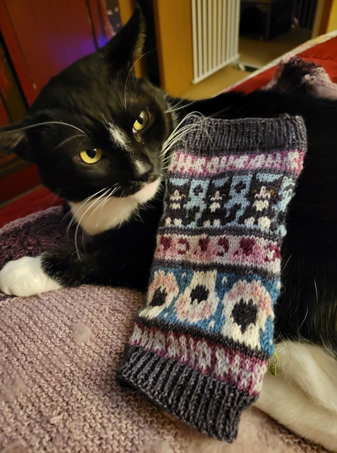 The Mother of Cats pulled out her new rigid heddle loom and warped on some really nice pink sock yarn. I think that this color looks really nice with my coat, don’t you? She spent a couple of days weaving on it, and was really happy, but had this urge to knit something, so… she started on a zebra.