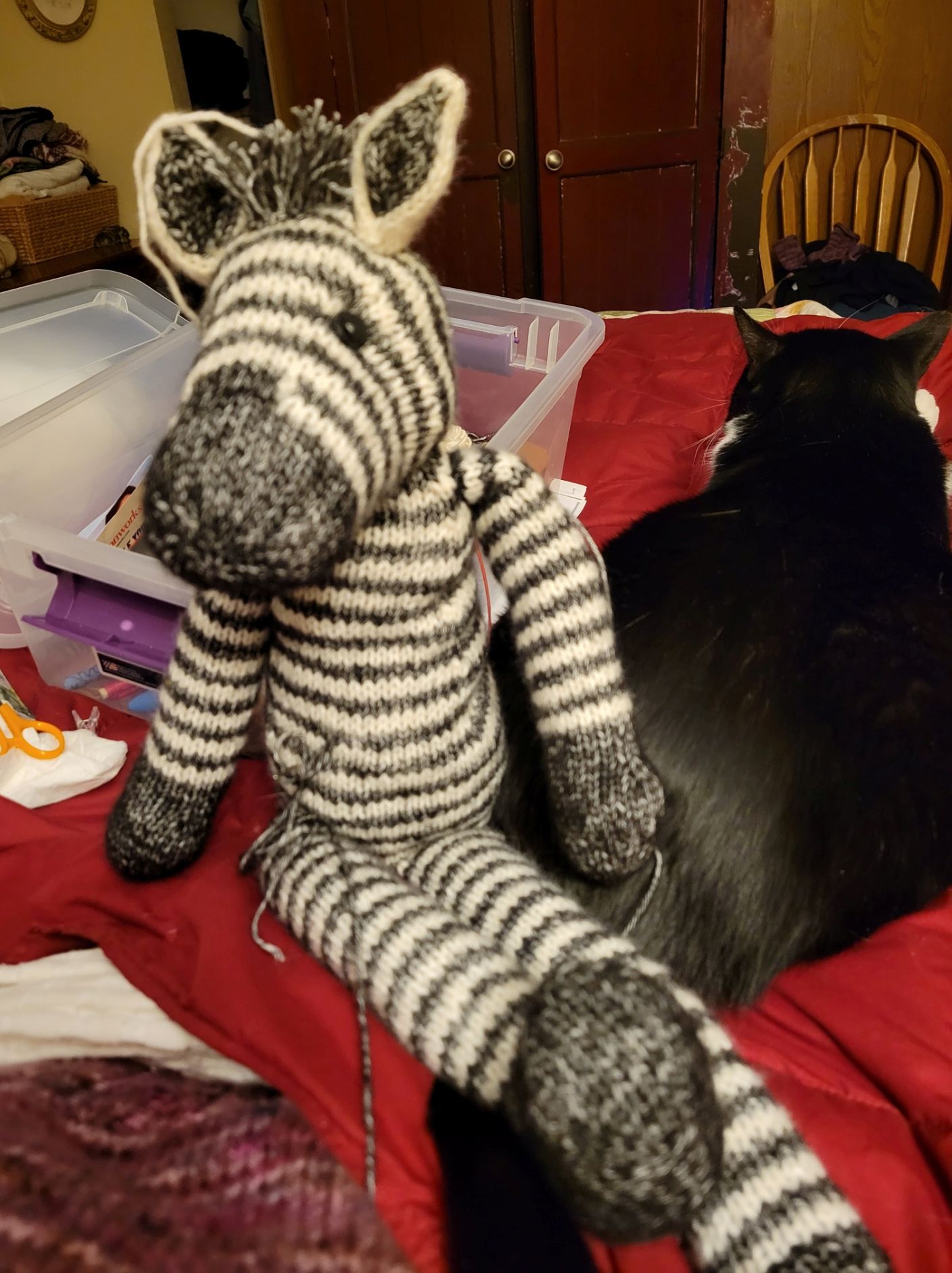 He is a pretty cute zebra, isn’t he? I was just exhausted helping the Mother of Cats with all of this, especially with the sewing and stuffing parts. The zebra still needs his little playsuit to be knitted for him, but the Mother of Cats has the attention span of a mouse because she just jumped off and spent the whole afternoon on the computer watching the first lesson for her online weaving class. Whew. That lady talked, and talked, and talked, and Mateo started to throw a tantrum because he really, really needed someone to play with him. I was getting a little peckish myself and thought that the Mother of Cats should give me some COOKIES, so she had to multi-task attending to our needs while walking around listening to her weaving lecture on her phone. Listen, the Mother of Cats needs to get her priorities straight, right?