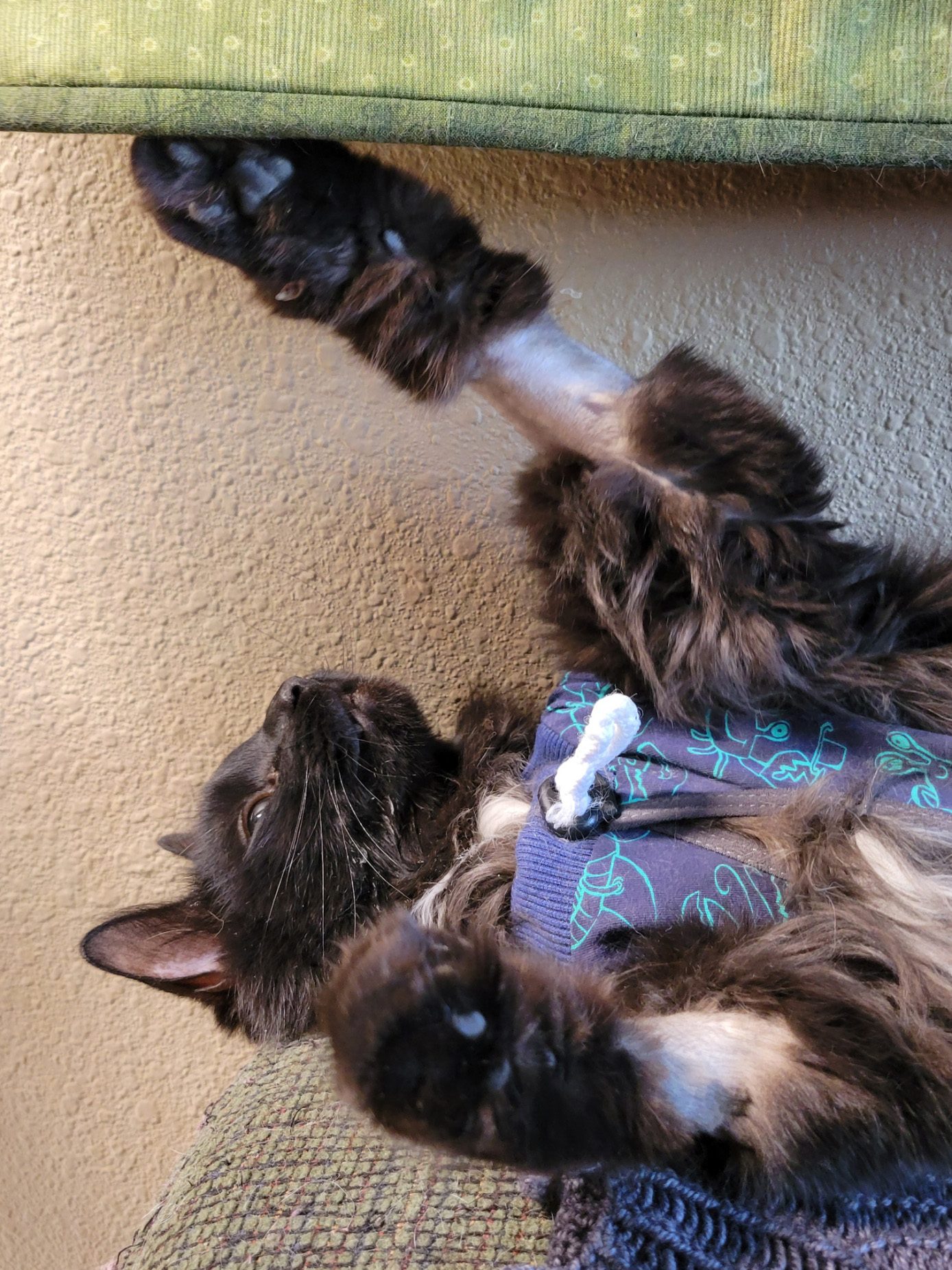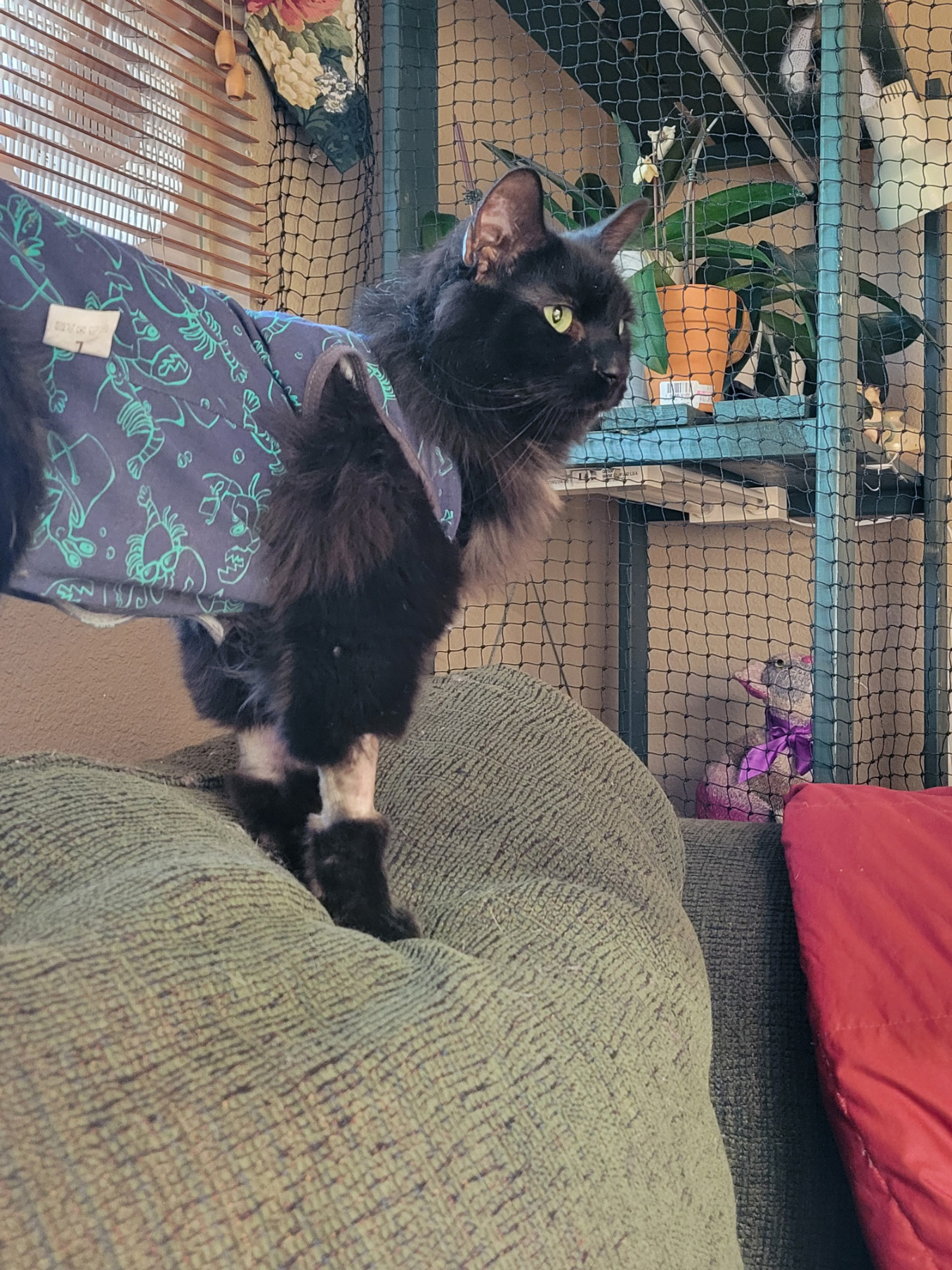 Last Saturday the Mother of Cats took me home to see if I would eat there. She took off that horrible cone and put me into a surgical recovery suit that she found on Amazon. I look pretty silly, but I was happy to be home: I found the food bowel and started chomping within 10 minutes of getting home.
