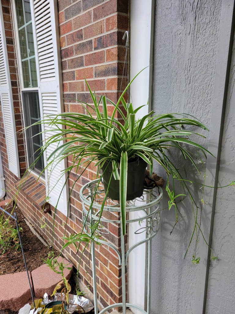 The Mother of Cats has been at work cleaning out the gardens and putting new plants everywhere. A lot of the plants from indoors have moved out here, and it really is kind of nice out here now. She bought a new rose bush!! There certainly is a lot of wildlife in the yard by the catio… maybe they like the flowers too.