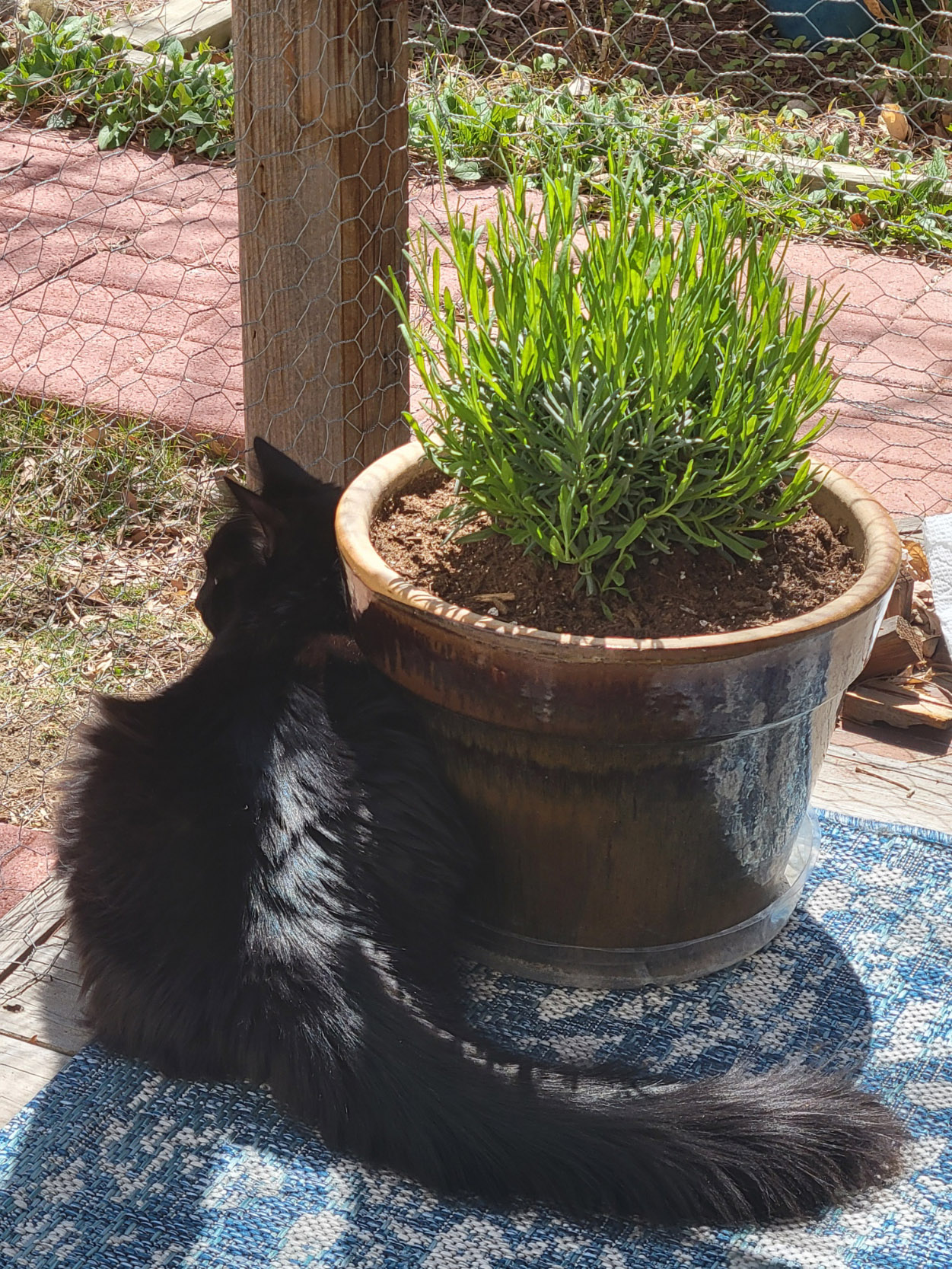 There are 4 types of lavender here. The large plant with Mateo for scale is a mystery lavender brought home from the grocery store. The little group of three lavender plants shows Provence Lavender (the tall plant), English Blue Spear Lavender, and French Lavender ‘Otto Quast’. The Otto Quast is having issues with its nationality, evidently, because the tag says English, but the internet is sticking with Spanish. I await some blooms from this plant…