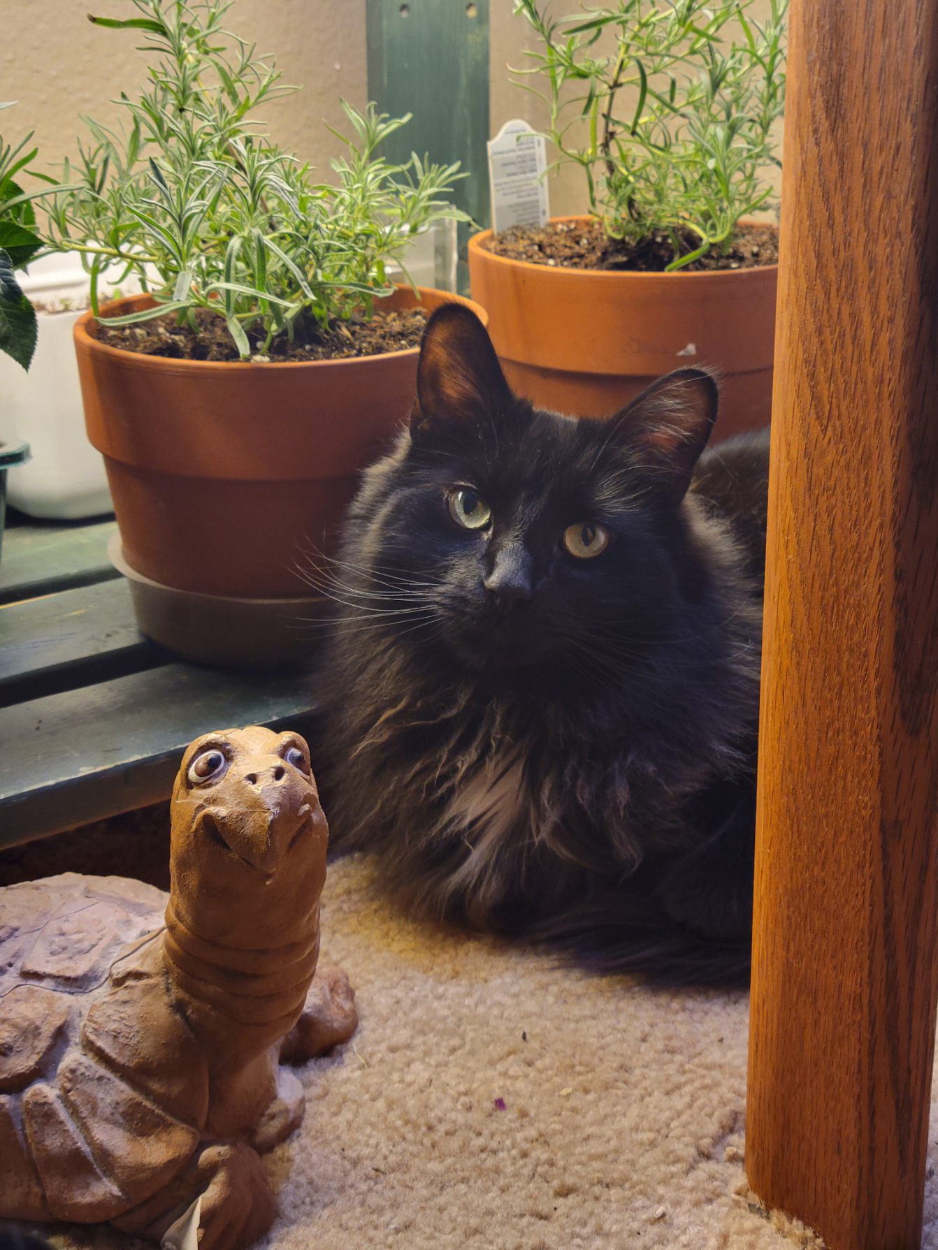 Just a little more about the garden. I have sources of water out for bunnies and birds, and the yard is filled with birdsong and regularly visited by bunnies. My new neighbor loves the bunnies, and evidently they have babies next-door, and the adults use my yard as part of the Bunny Highway towards the front yard shaded pastures. Out in the front, my new neighbor has bird feeders, another birdbath, and little bunny statues.