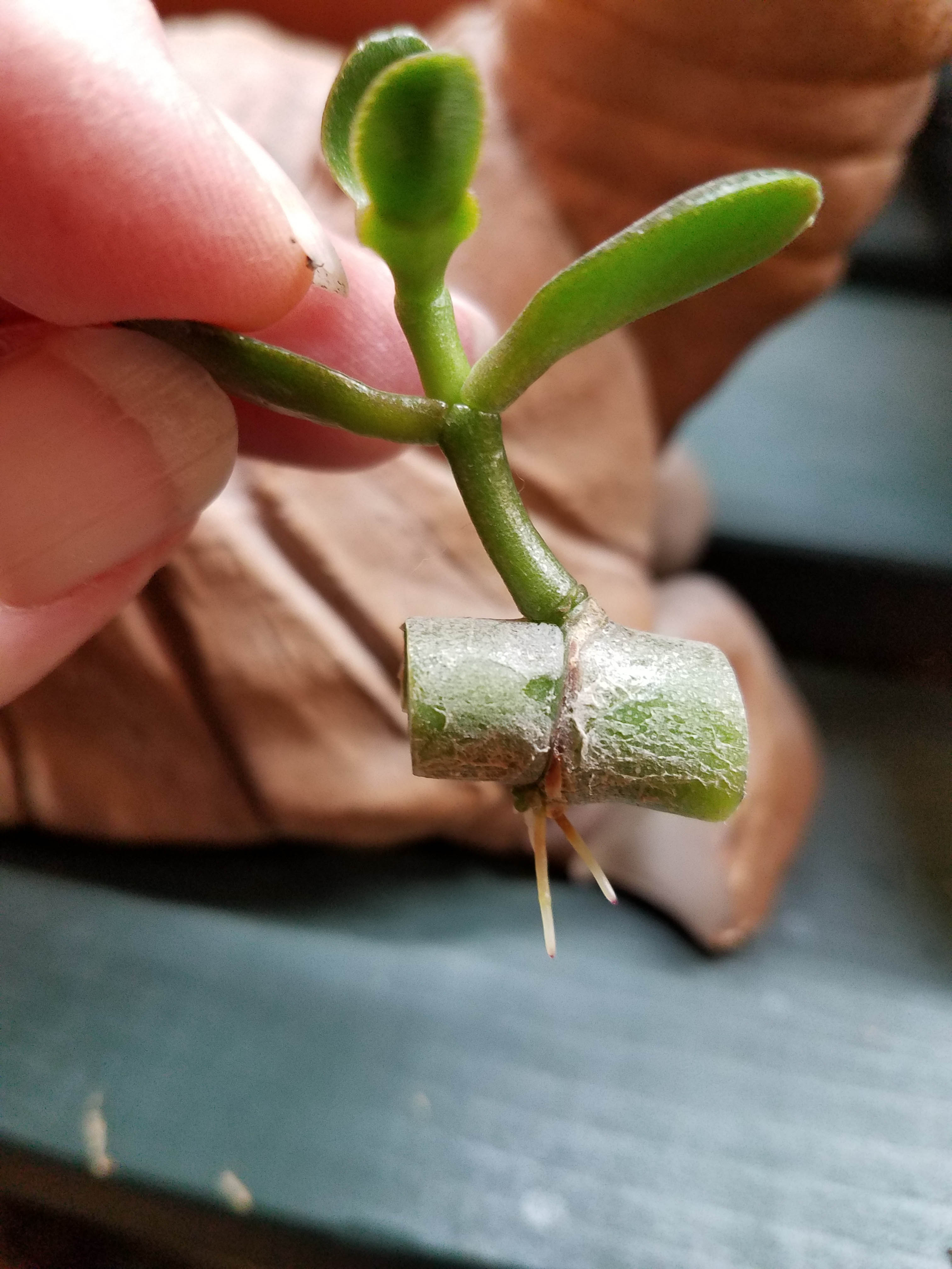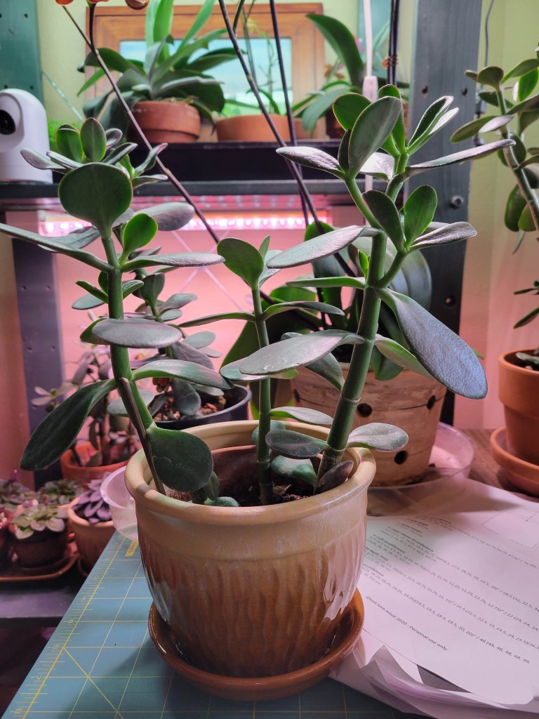 So easy to get a new plant. I made four pots with cuttings, gave two away and kept two with me. They grew really well in my indoor garden under the grow lights and then in the summer I put then outside in a shady location, and they really took off then. These cutting are now the grandchildren of my original plant, but also genetically identical to that jade.