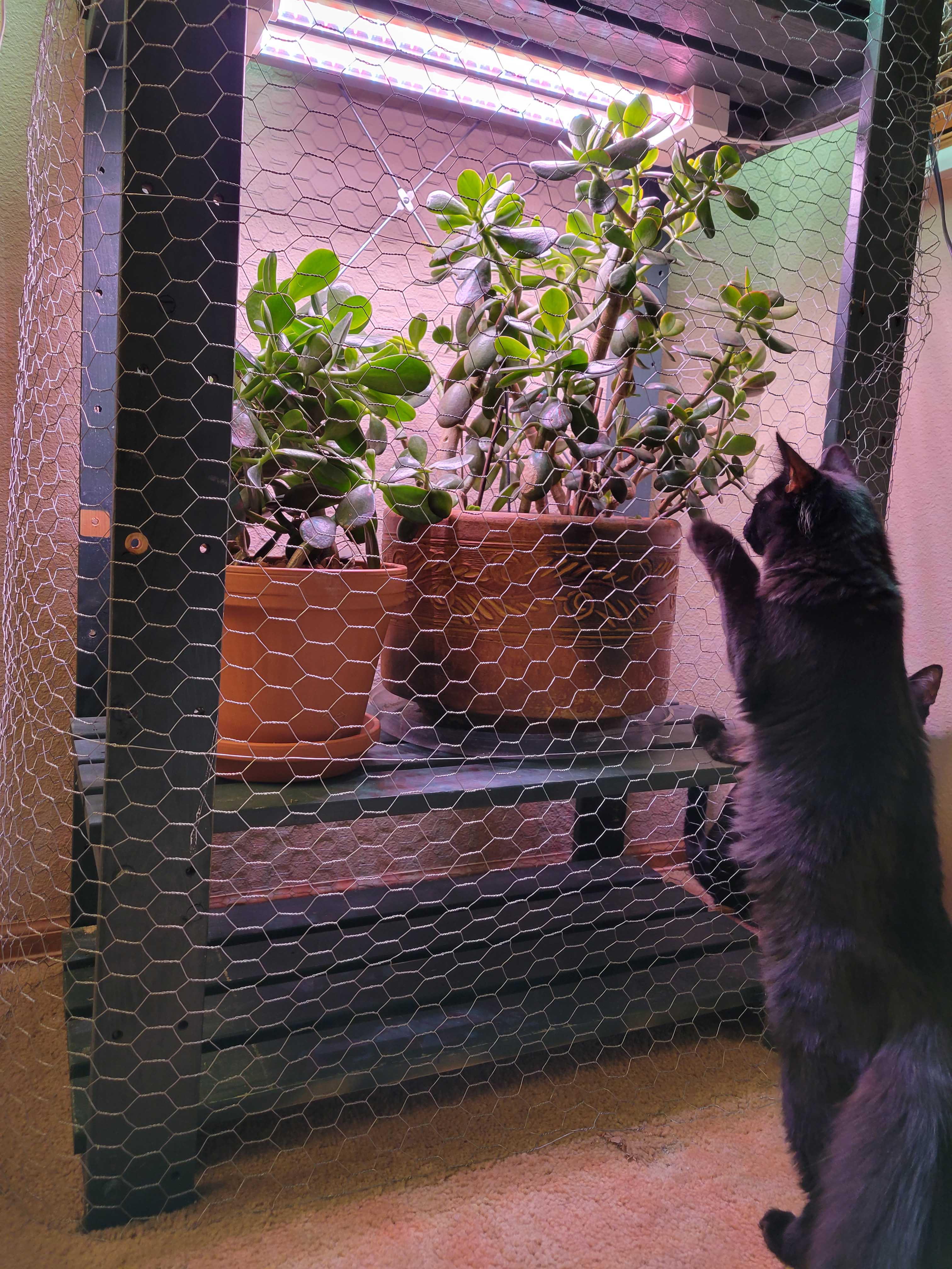 The jades are 4 years old now and too big to get behind the chicken wire indoor garden. Mateo and Hannah don’t mess with them, so they are growing in the front room. Everything was fine until…