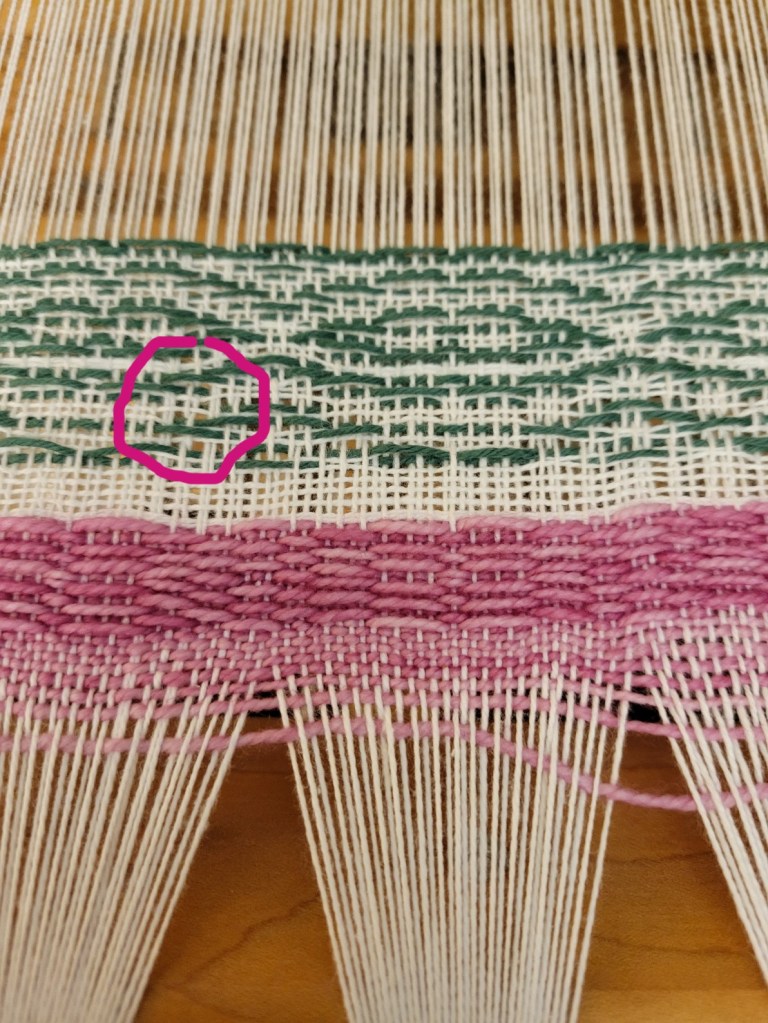 If you look inside of the pink circle (hey, don’t judge my circle drawing skills… I’m a cat… paws…) you will see a couple of spots where two threads (AKA strings… or if you are Mateo… CAT TOYS!!) are hanging out side by side as they move up the weaving. Oops. That’s a problem I guess. The Mother of Cats spent hours fixing that mistake and a couple of others absolutely forgetting my evening tuna snack. Why is the Mother of Cats like this?