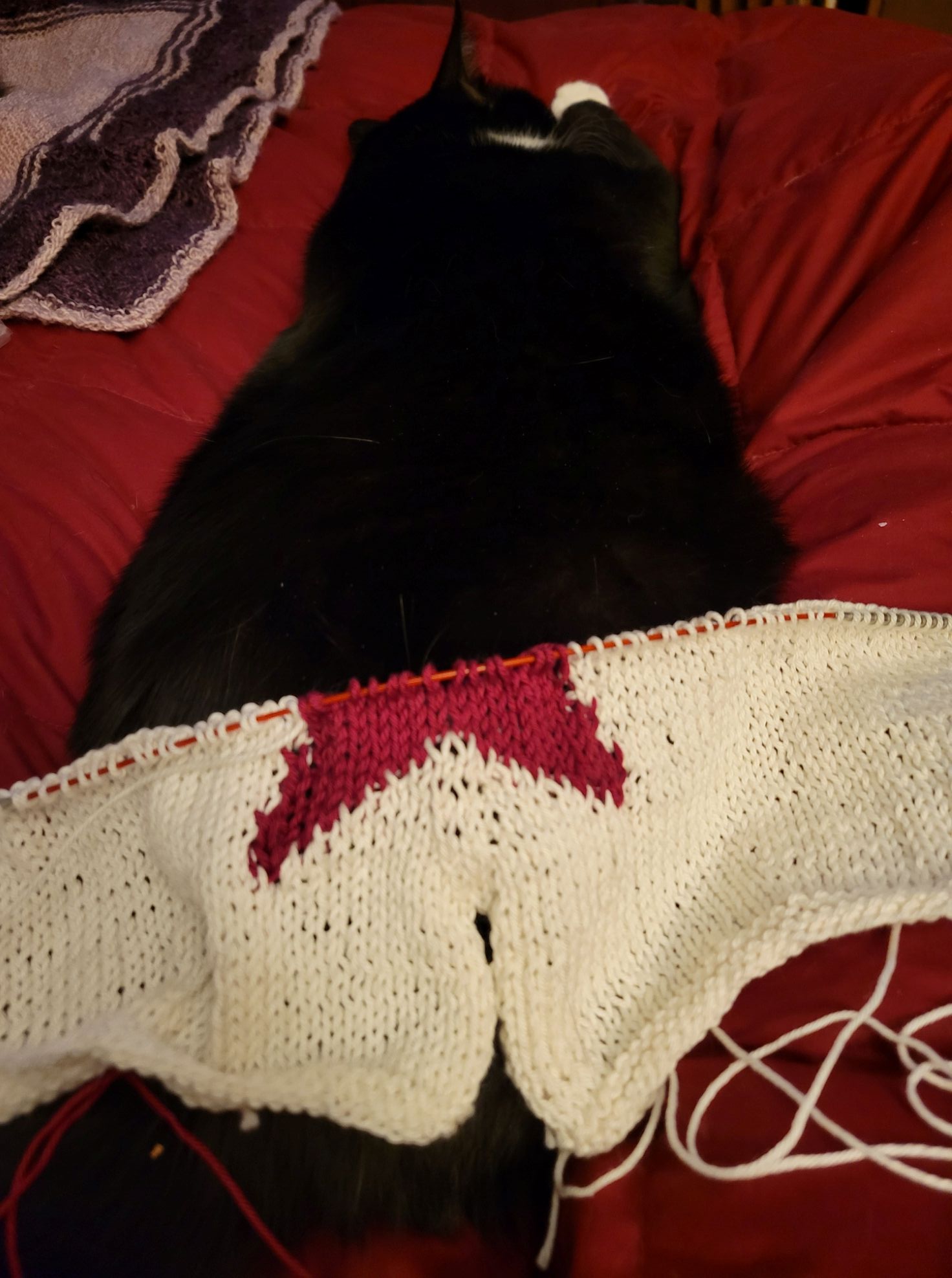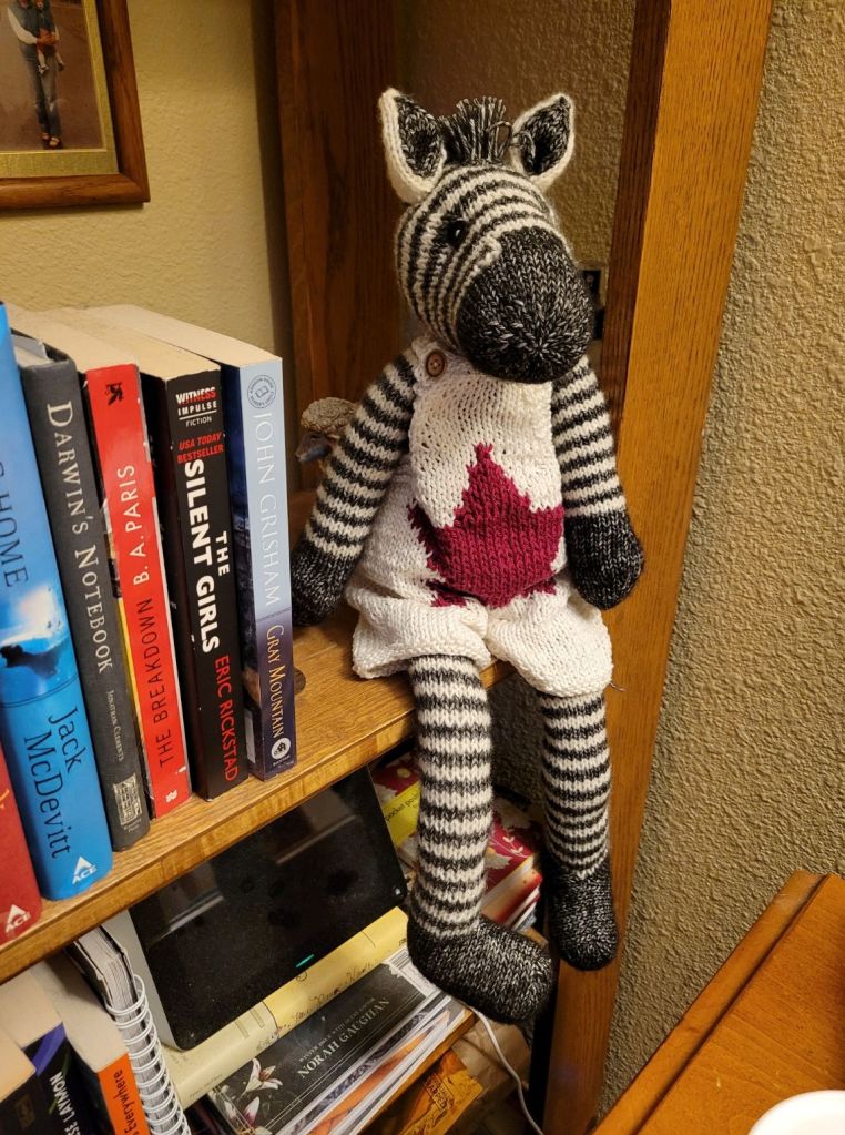 In the daytime the Mother of Cats worked on knitting a little outfit for her knitted zebra. This is another bit of silliness that I don’t really understand, but it is nice to hang out with her while she knits. The outfit got done this week and I do have to admit that it looks pretty darn sweet on him.
