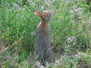 My neighborhood is just awash with cottontail rabbits. They are just dang cute and hang around houses and gardens where they snack with absolutely no remorse on lawns, gardens and weeds alike. Okay, they can be pests, too. I used to live on a street where you had to stop the car, get out, and chase the bunnies out of the street before you could drive through. It isn’t that these bunnies have a death wish; they sense danger in the movement of the car, freeze, and do their best to look like rocks. That’s the life of a bunny: everyone wants to eat you for lunch. Your best bet is to hope to look like a rock.