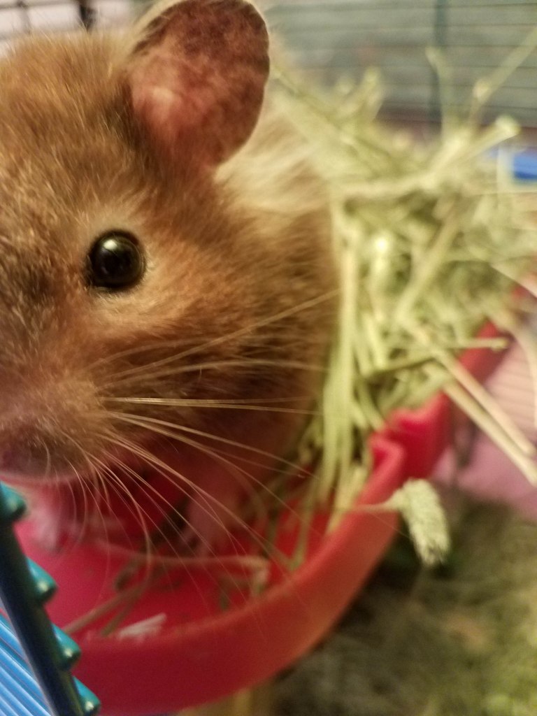 Pitty-Pat is a big, companionable hamster who actively squeeks at me to hand over some fresh food when she sees me. She isn’t afraid of me, but won’t let me pick her up at all; I never handled her while MacKenzie was here, because… cat claws and teeth!!