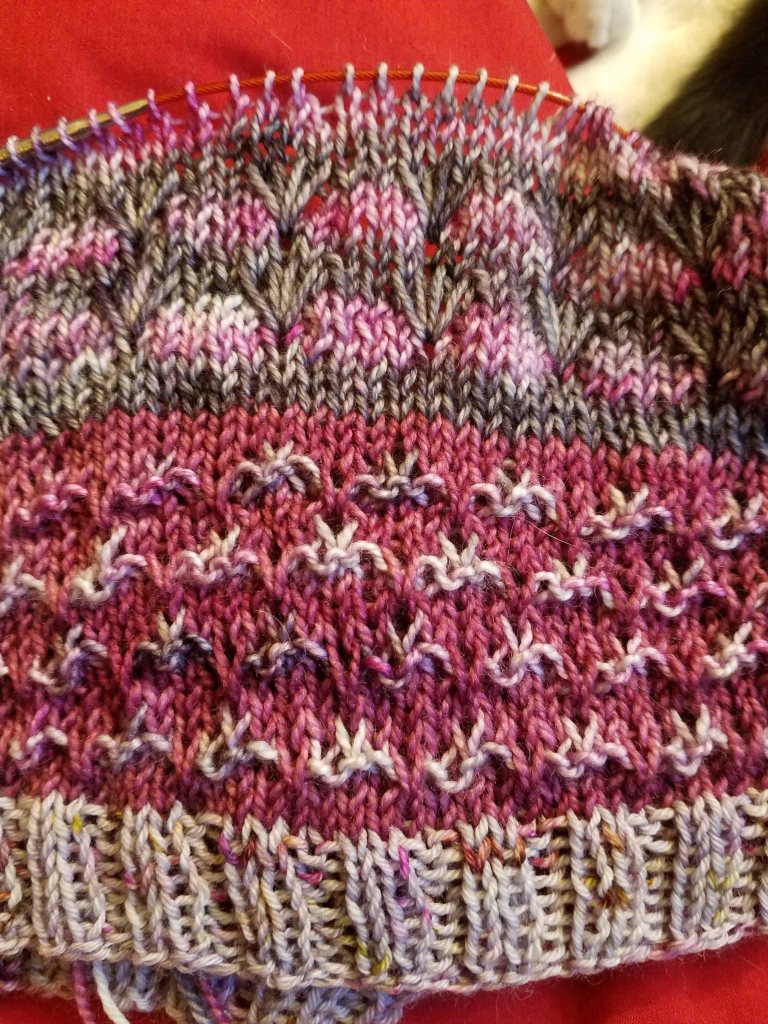 Yeah. I didn’t like the way the third color, the turquoise multi, looked. I wanted the gold next to the dark plum. I tinked back and dug around in the yarn stash.