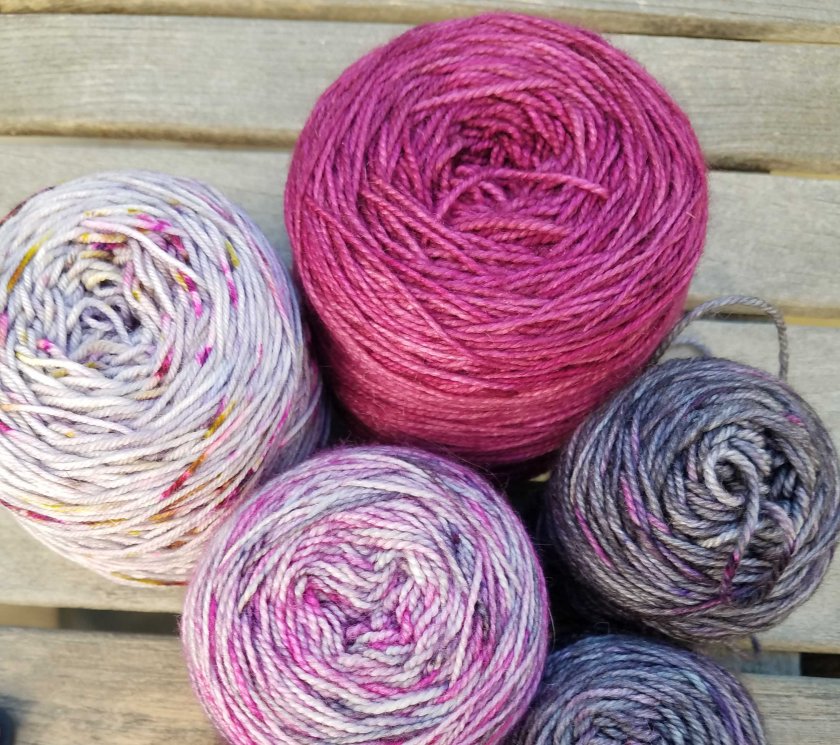 I started knitting using this order of yarns, starting with the dusty orchid and moving right.