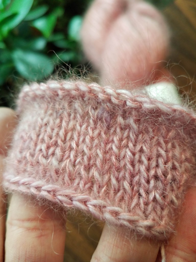 I first focused on the color. There was NO pink yarn at my local yarn store that would work with this mohair. I wanted pink with a little bit of speckle. Nope, nope, nope. There was baby pink, hot pink, brownish-pink, bright pink, but not the pink that I wanted. I want to keep the dusty greyish undertone in this yarn! I tried to swatch with various grey yarns hoping that the mohair halo would dominate. NOPE! I tried to swatch with a muted variegated yarn hoping that I would like it as an alternative. NOPE! Actually, that was a huge nope. I want that dusty pink!!