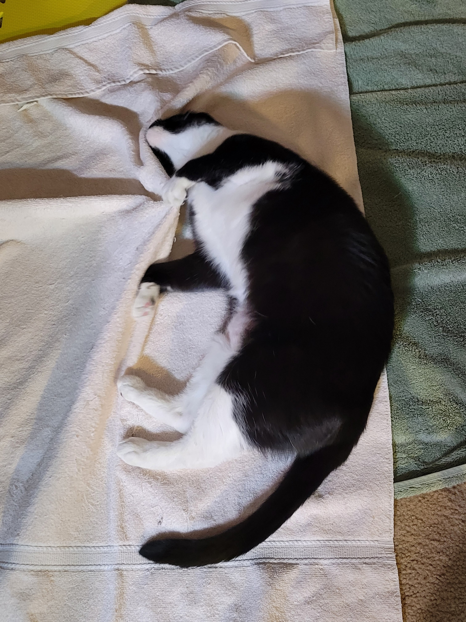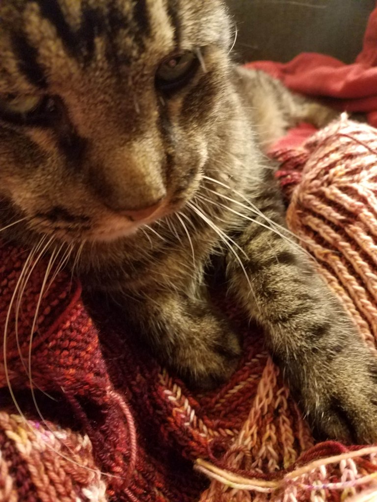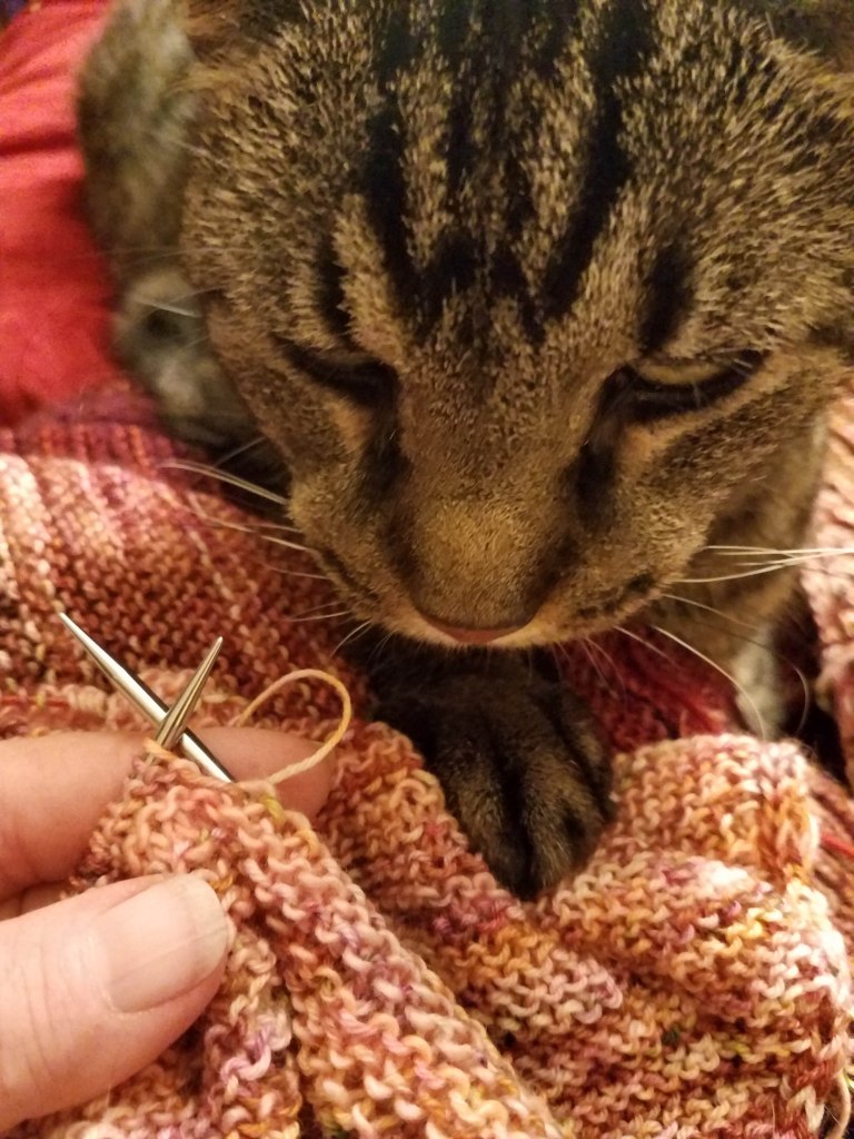Andrea gives good directions in the pattern on how to block using a good soak, sandwiching the sweater between towels, and then walking on it. Who are you??? I wondered. Have you been channeling my mother… she absolutely would block like this, but there was no way I was walking on my beautiful squishy (expensive) yarn. This yarn is superwash; I’m nervous about it stretching during blocking. While thinking of mom, I suddenly remembered her explaining how to steam the gathers out of a pinned sleeve before sewing it when I was a nervous teenaged seamstress. I decided to go with mom on this blocking adventure… I laid the sweater out on the blocking mats, misted it well with a spray bottle, and then gently steam blocked the gathers away with my iron while the yarn bloomed and the ribbing opened up. Yay!! I covered the damp sweater with towels to dry, and Hannah immediately moved in.