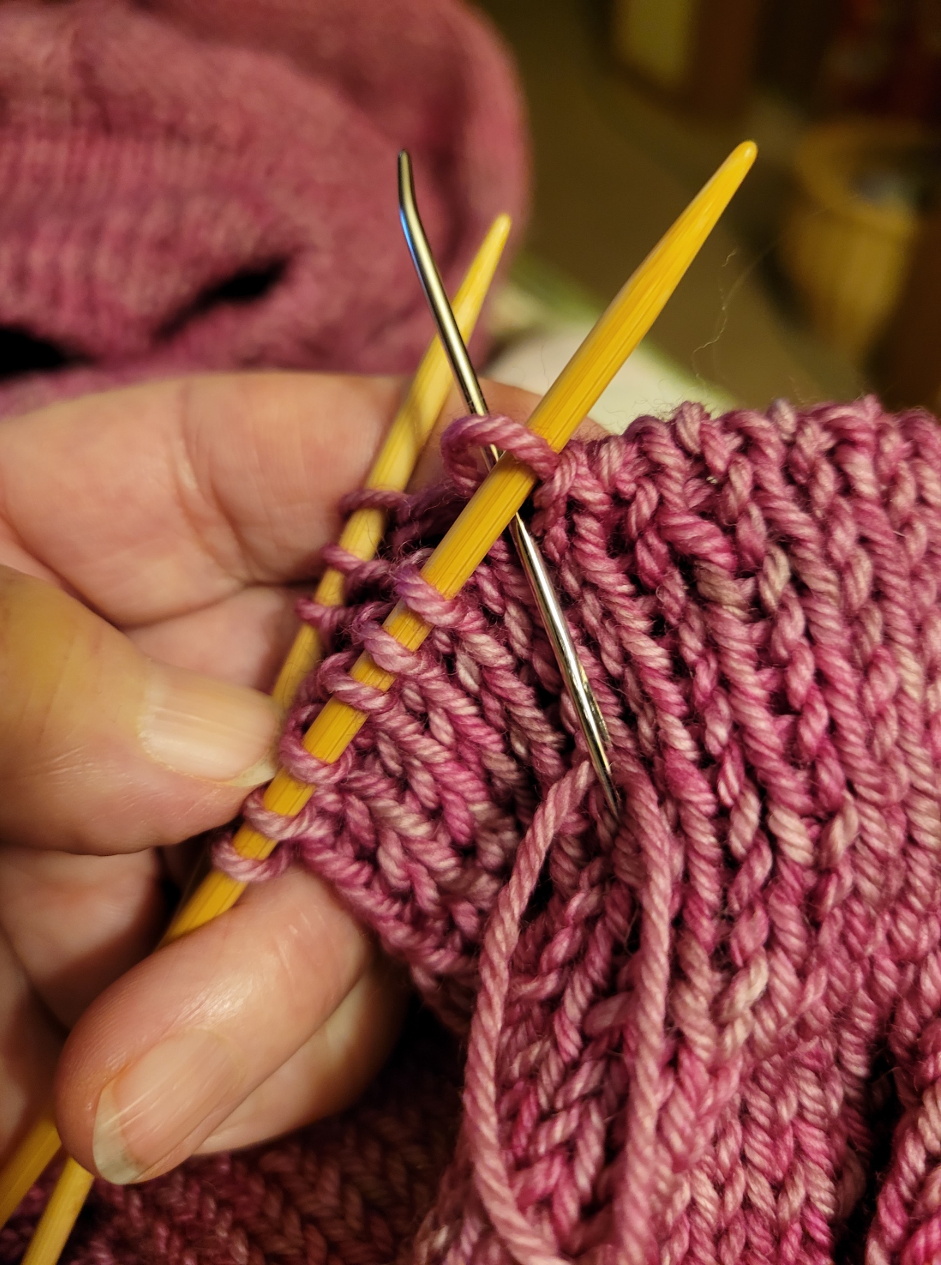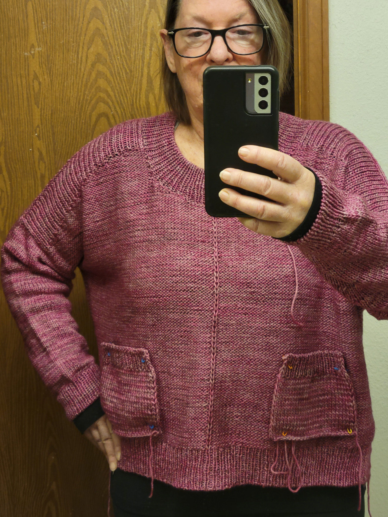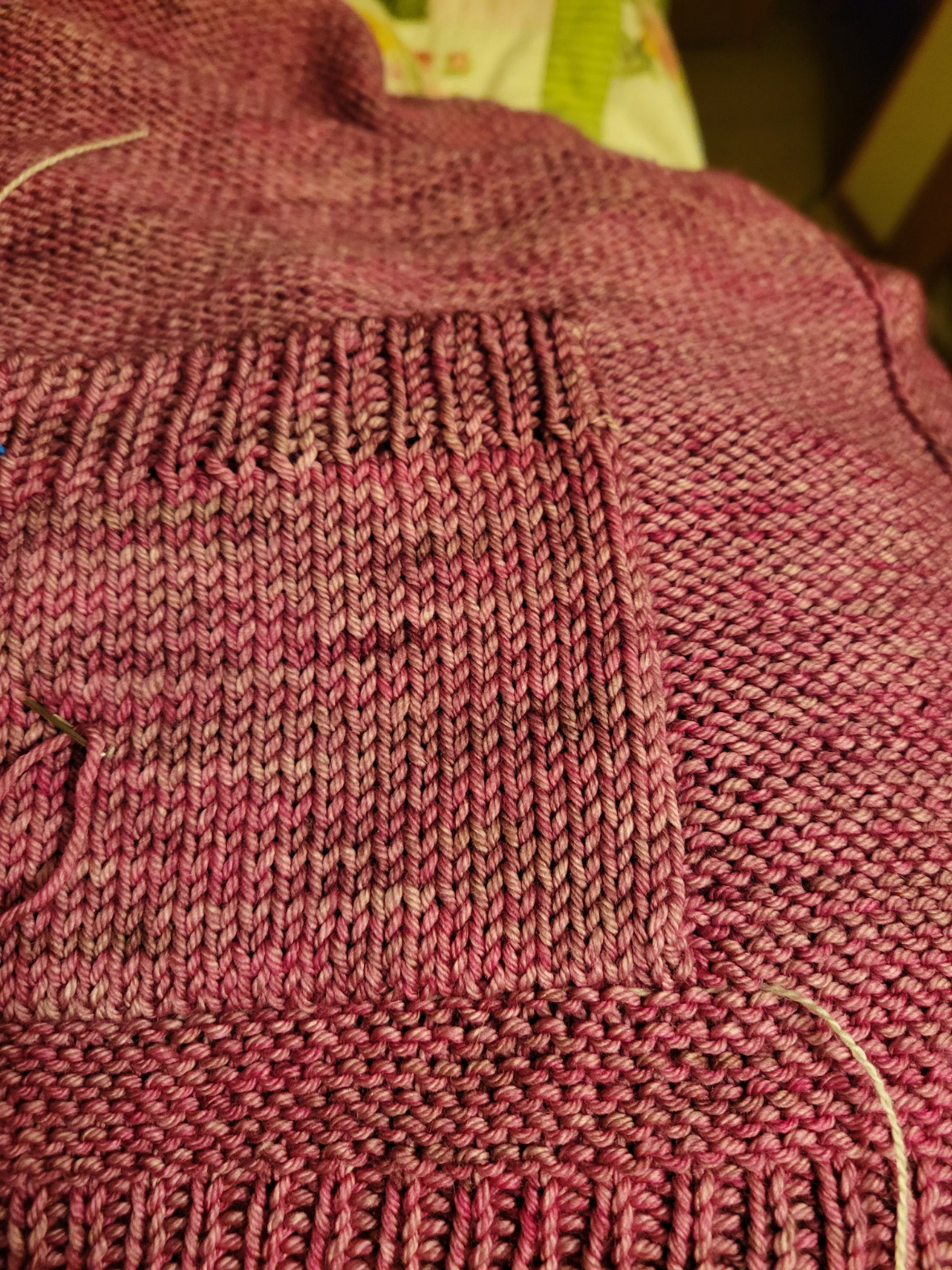 I used a lace weight yarn to outline the exact row of knitting that I was going to stitch into while attaching the pockets with mattress stitch. What a good idea, right? I also followed the tutorial directions in attaching the pocket bottoms, which gave me a perfect bottom edge. Wow. An old knitter can learn new tricks!