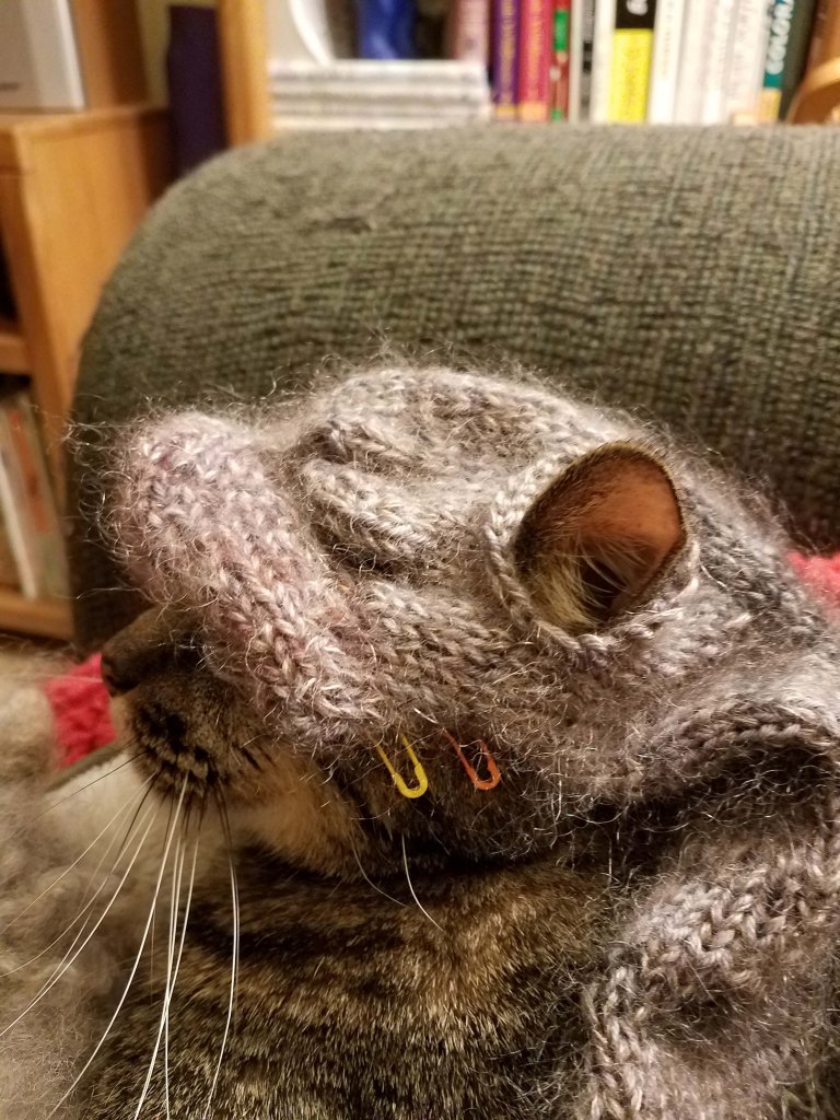 When they aren’t yarn chomping and staring at me (sitting on the pattern, of course) the cats have insisted on sleeping on top of me. These are big cats! The little one is over 15 pounds, and MacKenzie is a whopping 18 pounds of dead cat weight.