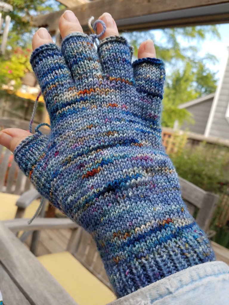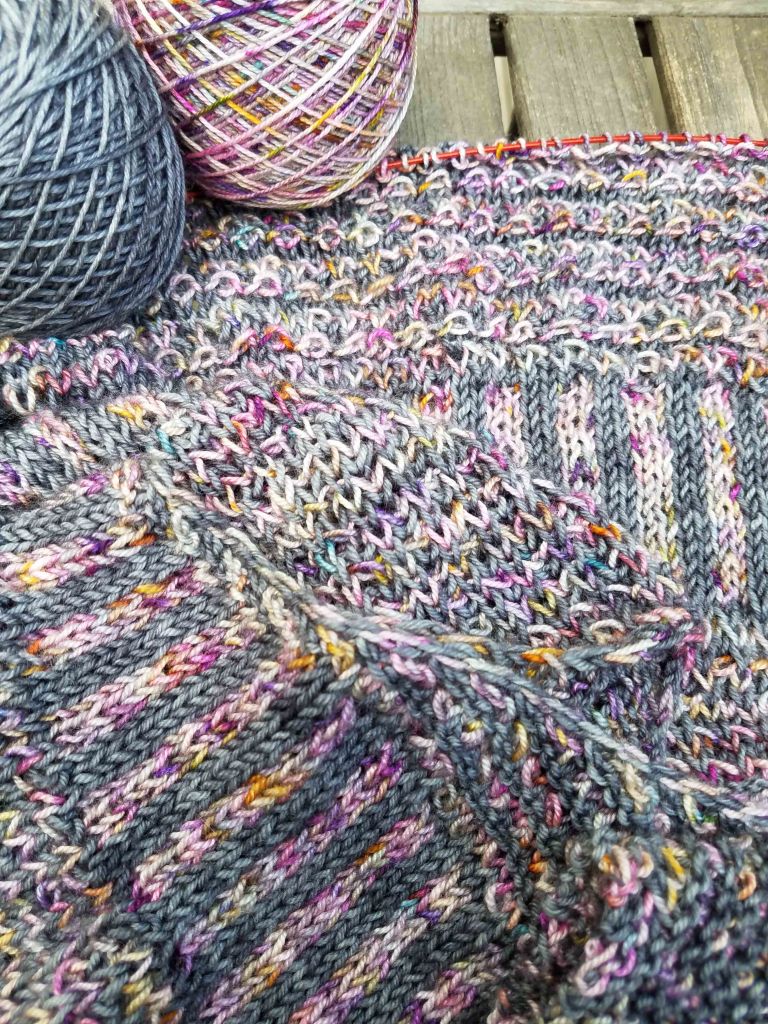 As it turns out this shawl is long and not deep at the point so it is challenging to photograph if the colors are subtle and the day is overcast. Please accept this indoor picture that kind of shows off the textures. I’m looking forward to using this as a serious layering piece in the fall and winter.