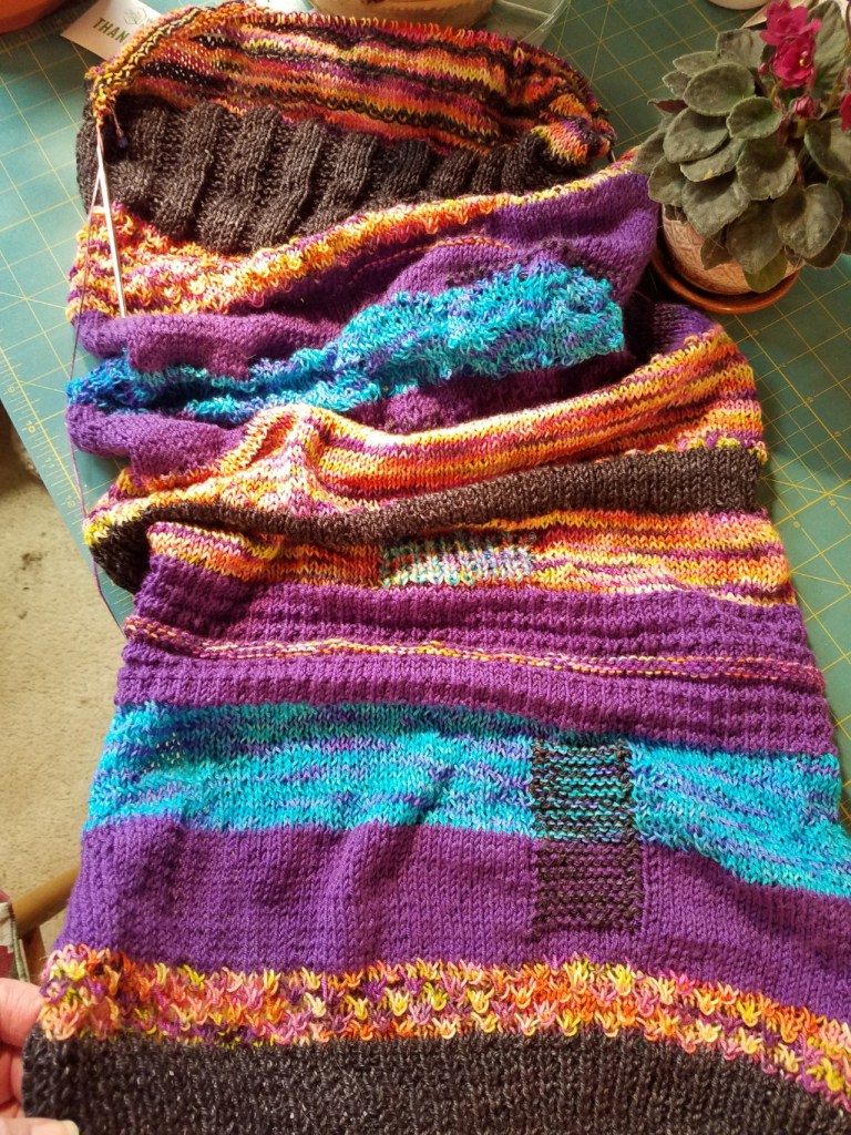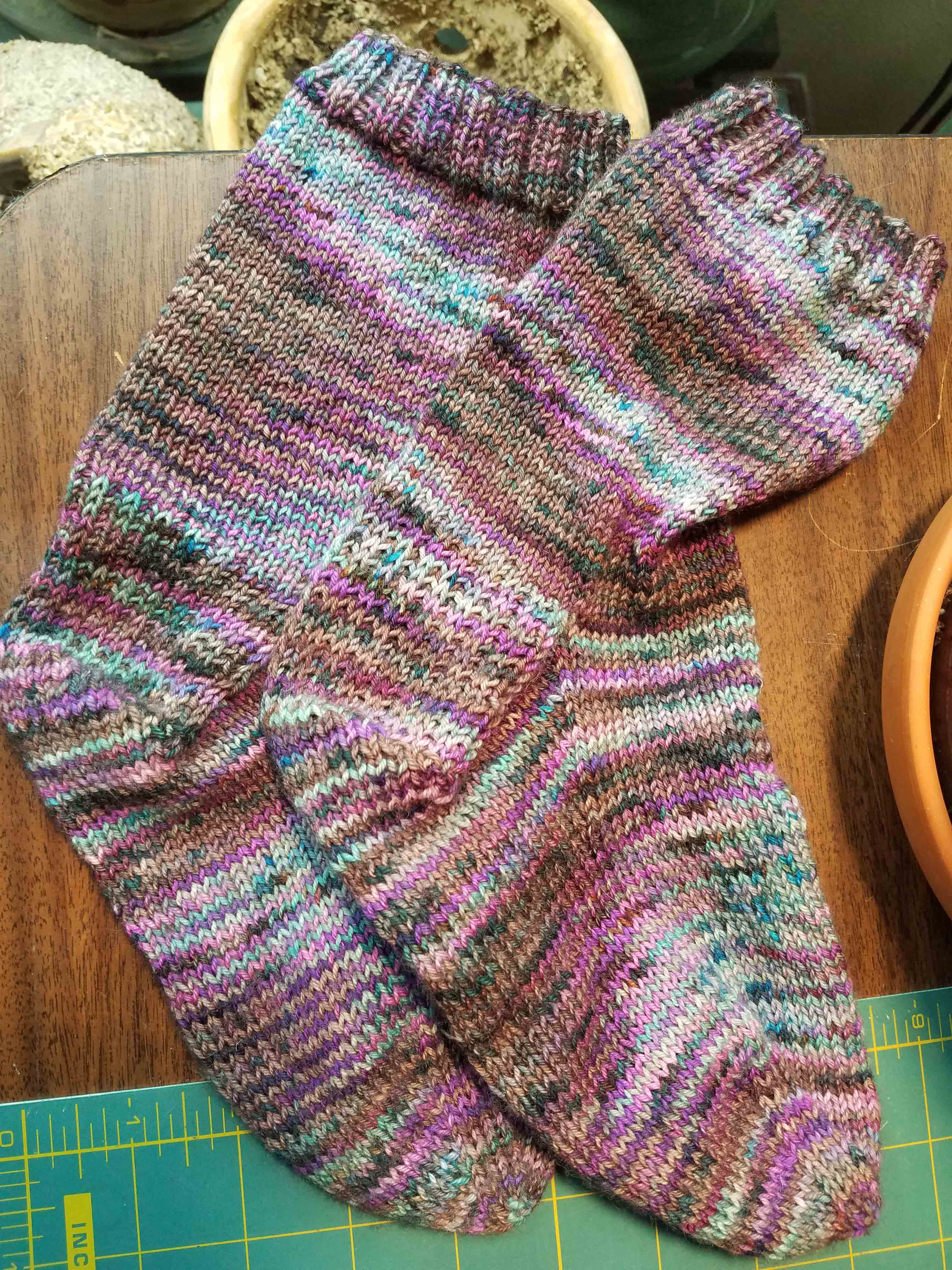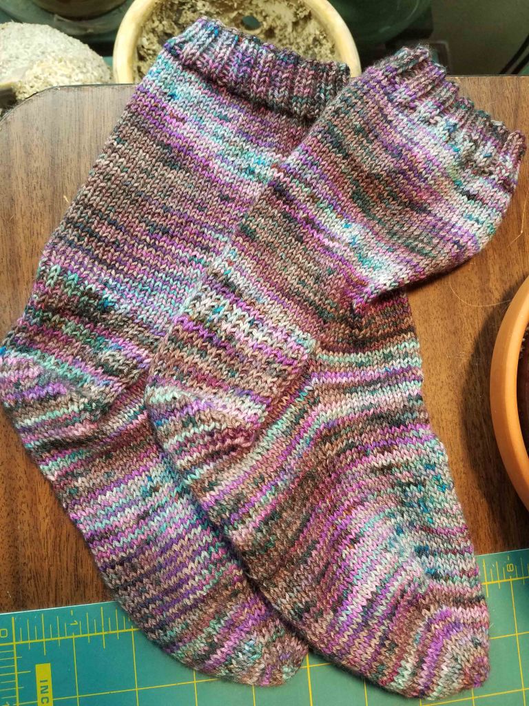Once I got through the heel section I stopped inserting the PSS stitches in the knitting on the foot of the sock: I purled on the top of the foot while sticking to smooth stockinette on the bottom of the sock (3rd picture). I lost some of the randomness in the line up of the colored strips but that part of the sock will be in my shoe so I’m good with it. The final picture shows the finished sock with its contrast heel and toe; kind of wish now that I had make the top ribbing that hot pink too. I’m now working on the second sock now and should eventually get the pair completed.