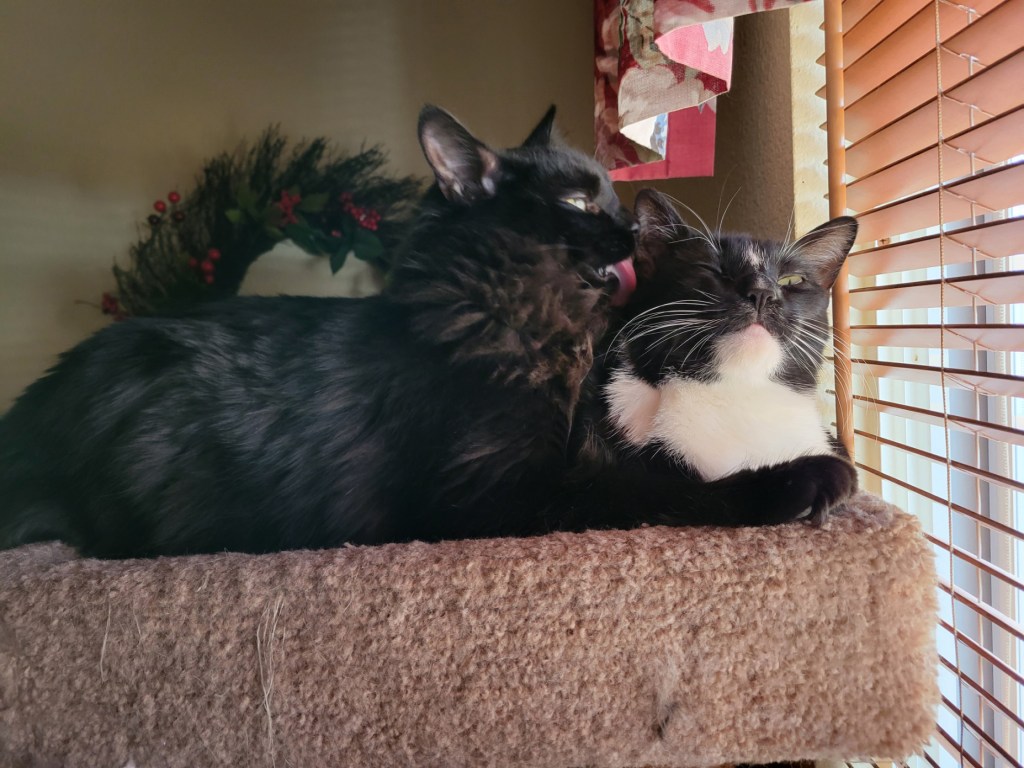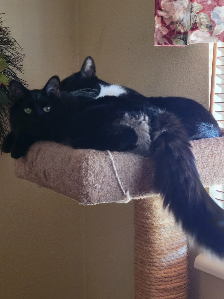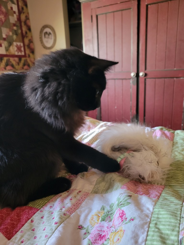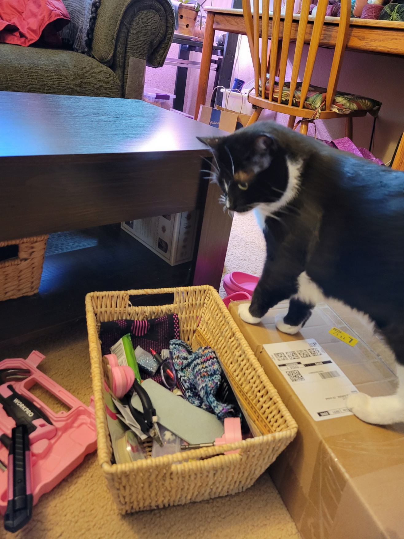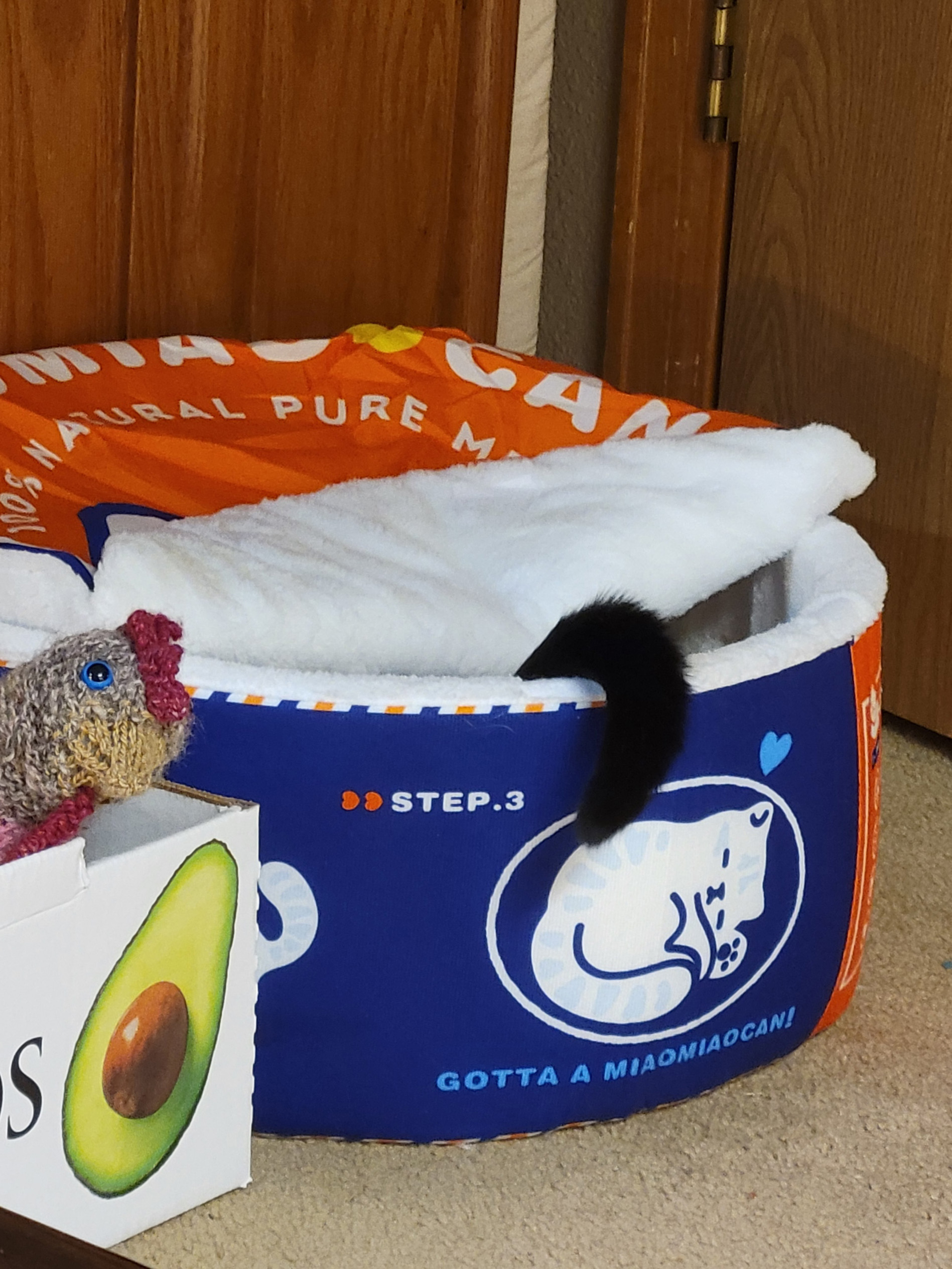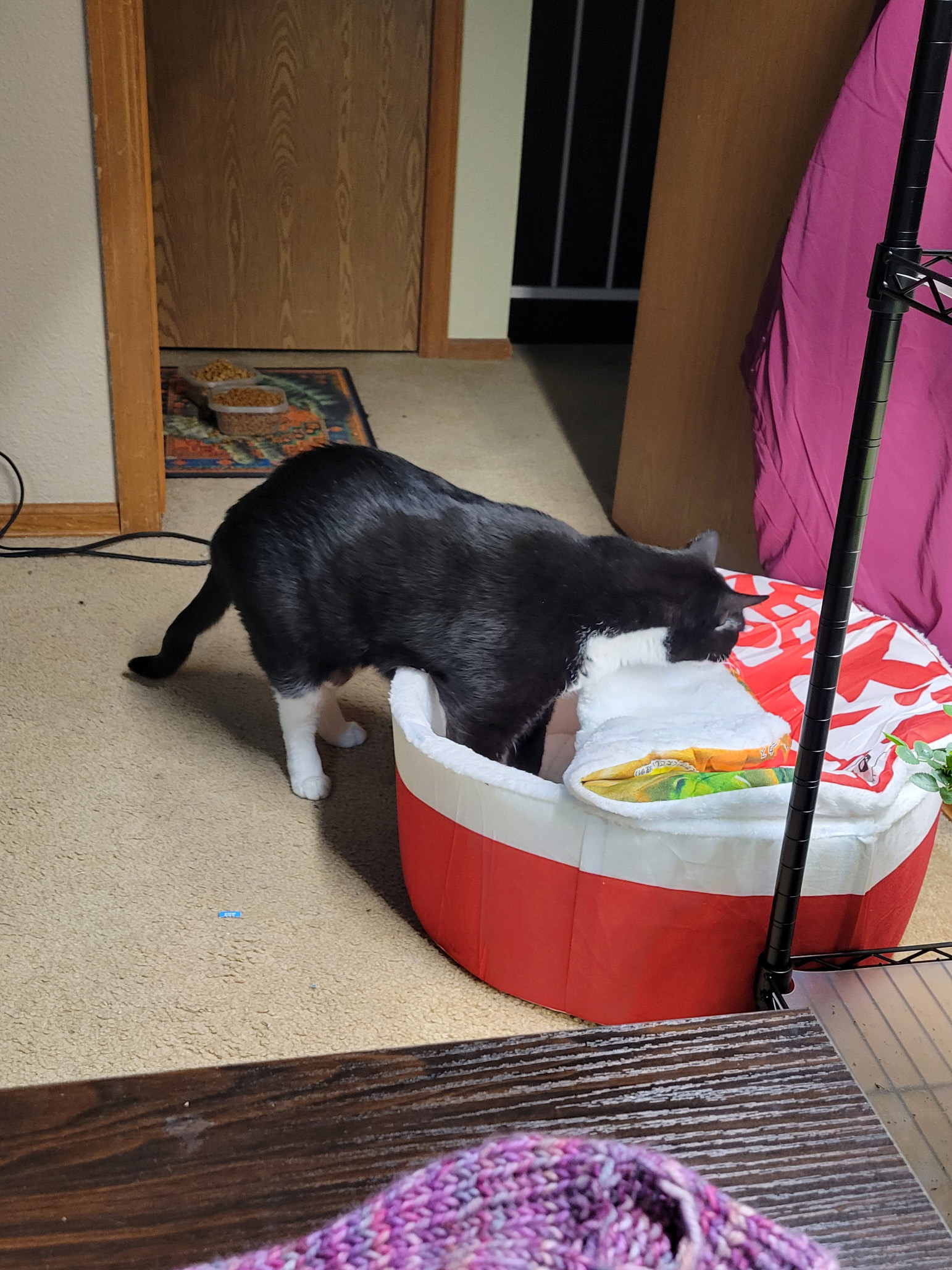 This has been kind of a busy week already. The Mother of Cats cleaned out her yarn stash (I helped, like… a lot!!) and then she cleaned out her quilting projects and put most of them into a big box that she mailed off to a cousin. Bye quilts. She has been doing a lot of cleaning and stuff, which is kind of fun for Mateo and me. We love the chaos!! We love all of the yarn moving around. We love our new cat beds!!!