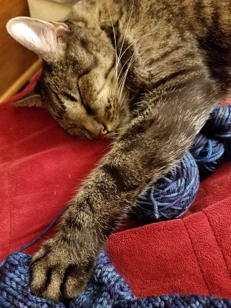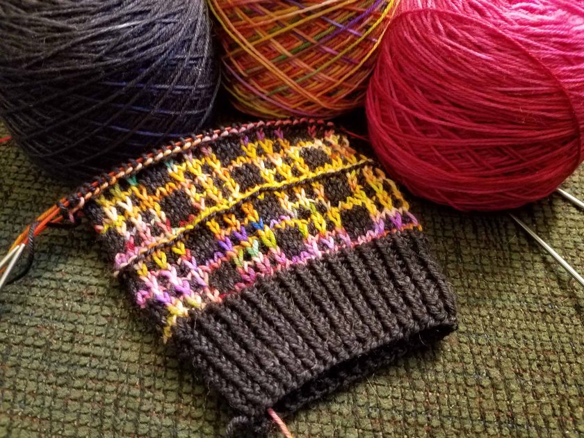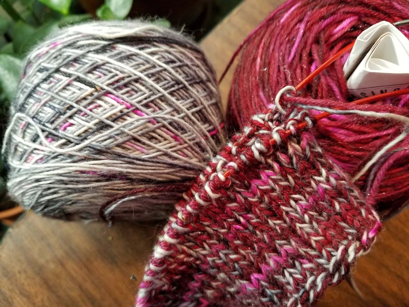I finished my assigned pooling socks using some Chasing Rabbits yarn from the stash with hot pink yarn for the toes and heels. I just purled the yarn when I came to the rainbow sections and threw in some random texture stitches (PSS) that I learned how to do while I was knitting The Sharon Show shawl last year. The section of the shawl where the stitches appeared was #21, the Catnip Garden, so obviously these are the Rainbow Catnip Garden socks. I just found some more Chasing Rabbit sock yarn that will work for assigned pooling. Yay! I’m down to only one knitting project at the moment so it is time to cast on more socks.