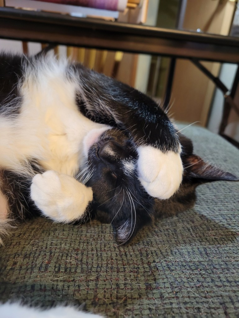Another glimmer: my son’s three cats were rehomed together to a wonderful lady who had lost a beloved cat. All three kitties are now happy in their new home, piling on and cuddling with her while she crochets in the evenings.