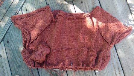The whole time I was knitting this tee I worried about how big the neck opening was. As soon as it was cast off the needles I tried it on, and yep, too big. I ran a drawstring around the neckline on the inside to draw it up a little and to prevent more stretching. Neckline problem totally fixed: it fits great! The top is loose and a comfy layering piece. I’m thinking that I would like to make a second one with long sleeves using a winter yarn that will be lighter in weight. Maybe in navy blue. I plan to keep that garter stitch band on the sleeve and will continue the sleeves in stockinette below the band.