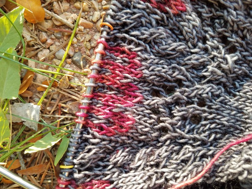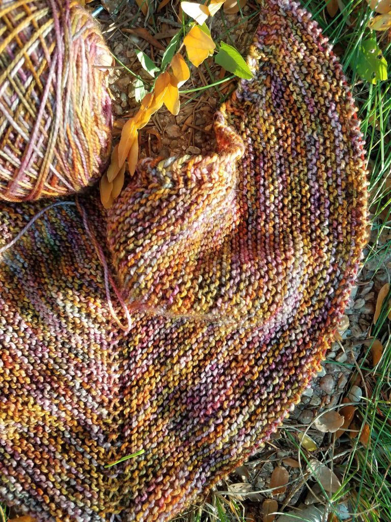 Lured into a sense of autumn by the cold and snow I cast on another garter stitch shawl using some Mad Tosh sock yarn in the colorway “Rocky Mountain Colorado” that looks like all the colors of fall.