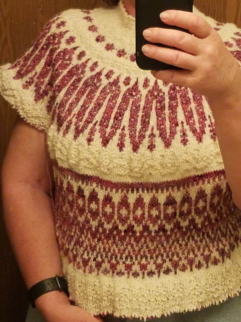And the sweater being knit in the pink (and cream) yarns is finally far enough along to get checked for size. A few more inches, don’t you think? Heavens, this sweater sure needs to be blocked, doesn’t it, but I’m really pleased that it looks like it will fit okay. This is Koivua by Caitin Hunter, and my project notes are here.