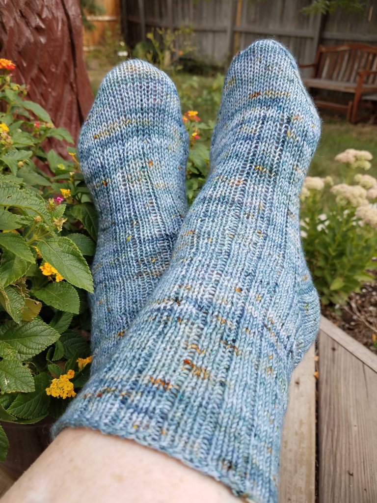Easiest knitting ever! I made these socks in a simple K3P1 ribbing that makes then fit well while providing mindless easy knitting in the evenings while listening to audiobooks. My project notes are here.