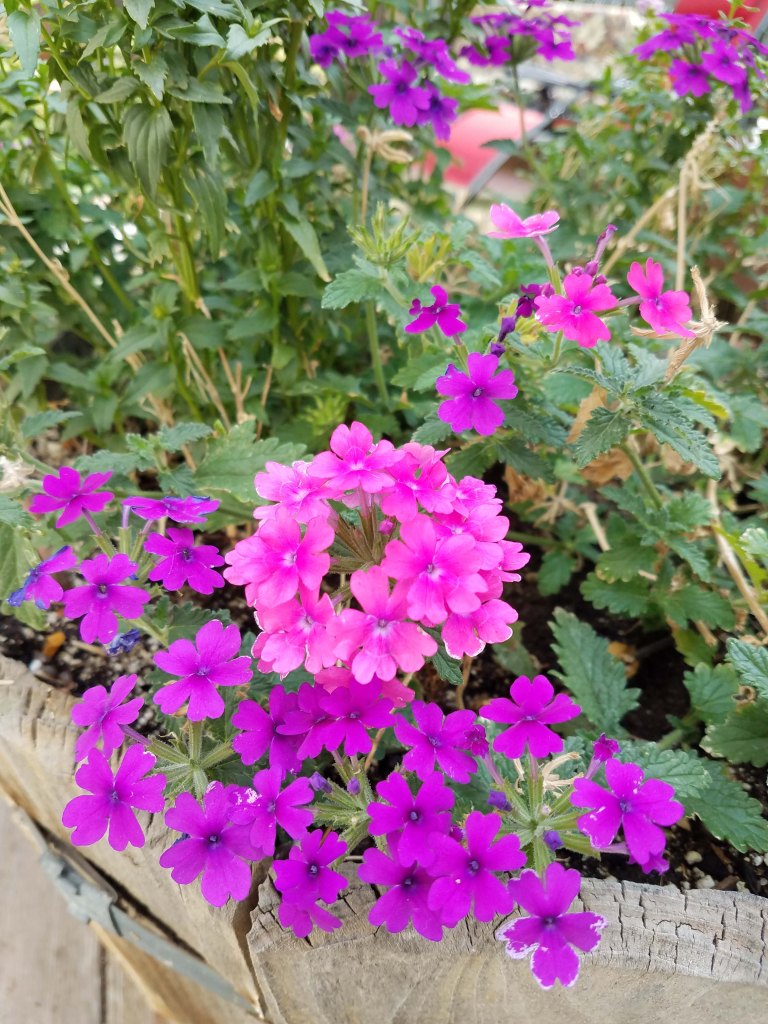 All of the flowers in pots on my deck have recovered and are putting out blooms. These, I think, are verbena.