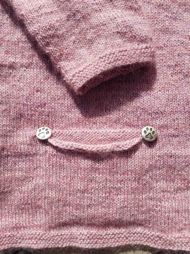 Finally, I finished up my Pebble Tunic this week. The pockets are sewn up, the ends are all woven in, and as you can see, I put on the cat paw buttons.