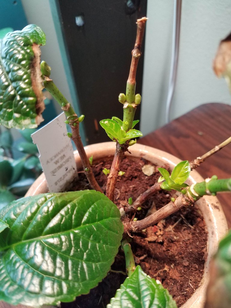 This hydrangea is the worst of the bunch! All of its indoor leaves burnt, died, and dropped off. Now it is putting out lots of new growth and appears to be coning through the transition okay. Once it has the new growth out and is looking more healthy I will repot it.